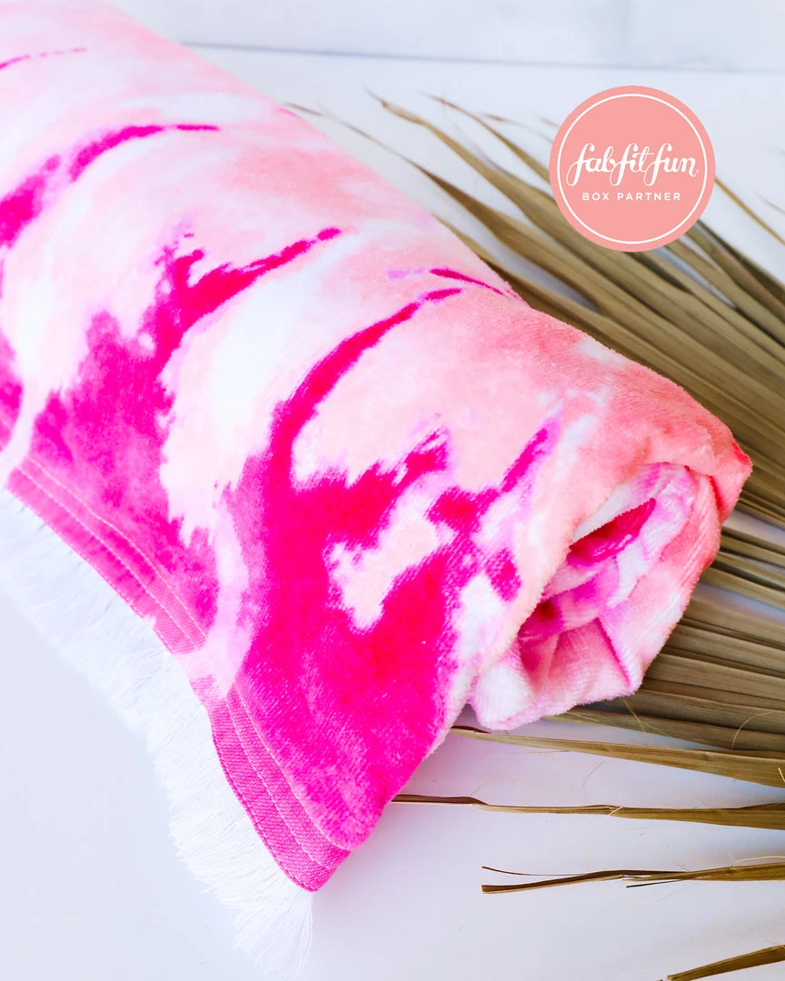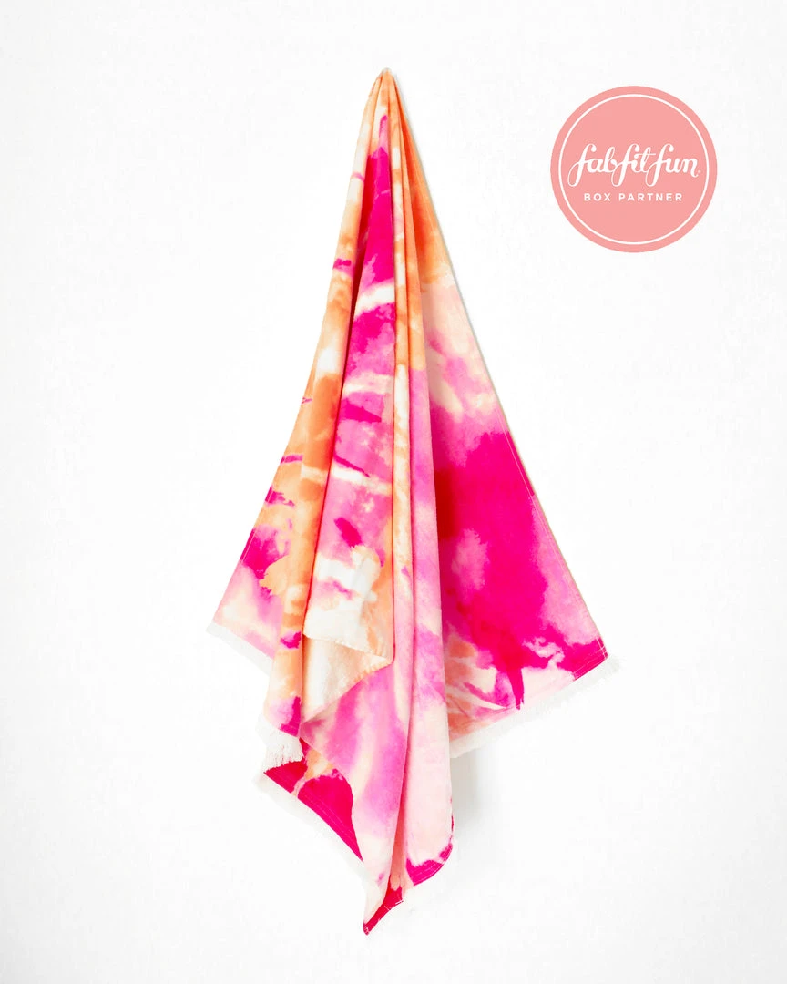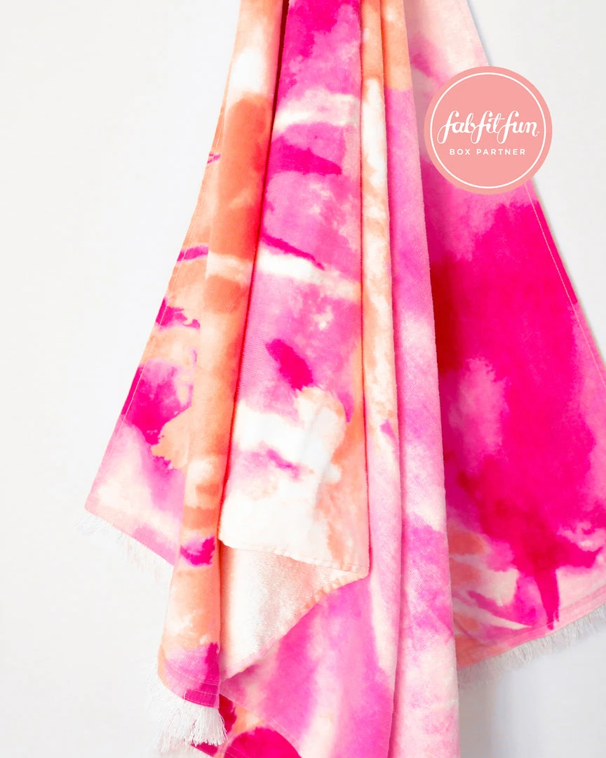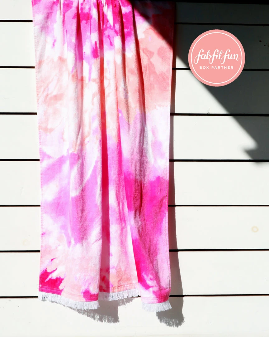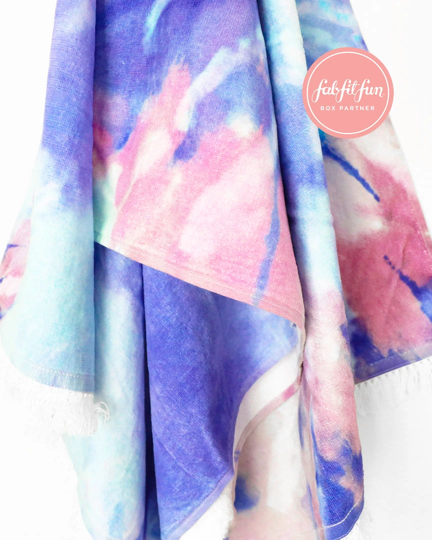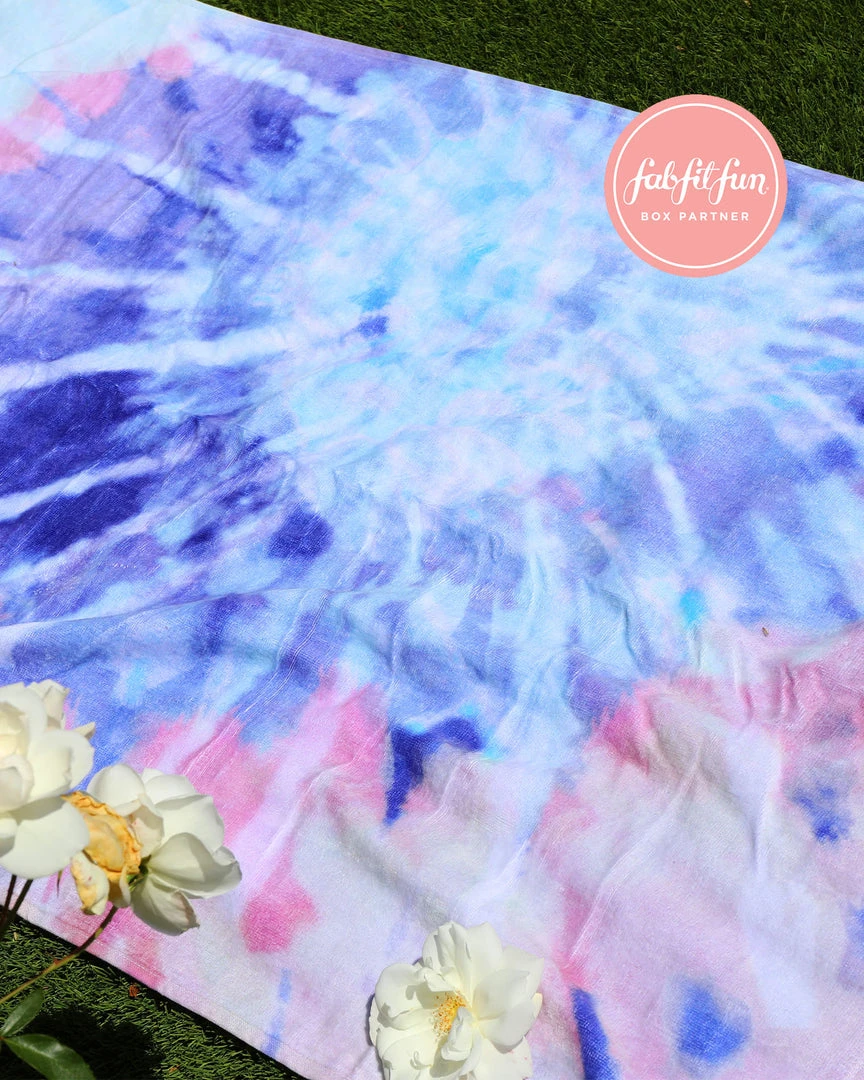 Every great bikini deserves a tie dye towel! This FabFitFun collab tie dye towel is perfect for everything from beach days to summer picnics. Constructed in super-soft 100% cotton, lightweight french terry for soft and absorbent post-pool perfection. Dense yet lightweight, this is a must-have!