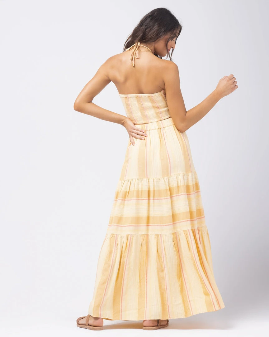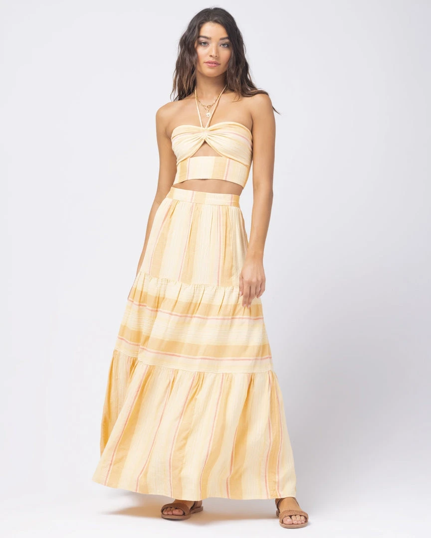 Make it a sunshine day with the Blue Skies Tube Top. Crafted from Cozumel Stripe yarn dye fabric and accented with a center cut out, this tube top features a smocked back with adjustable halter ties, ready to get you some rays.