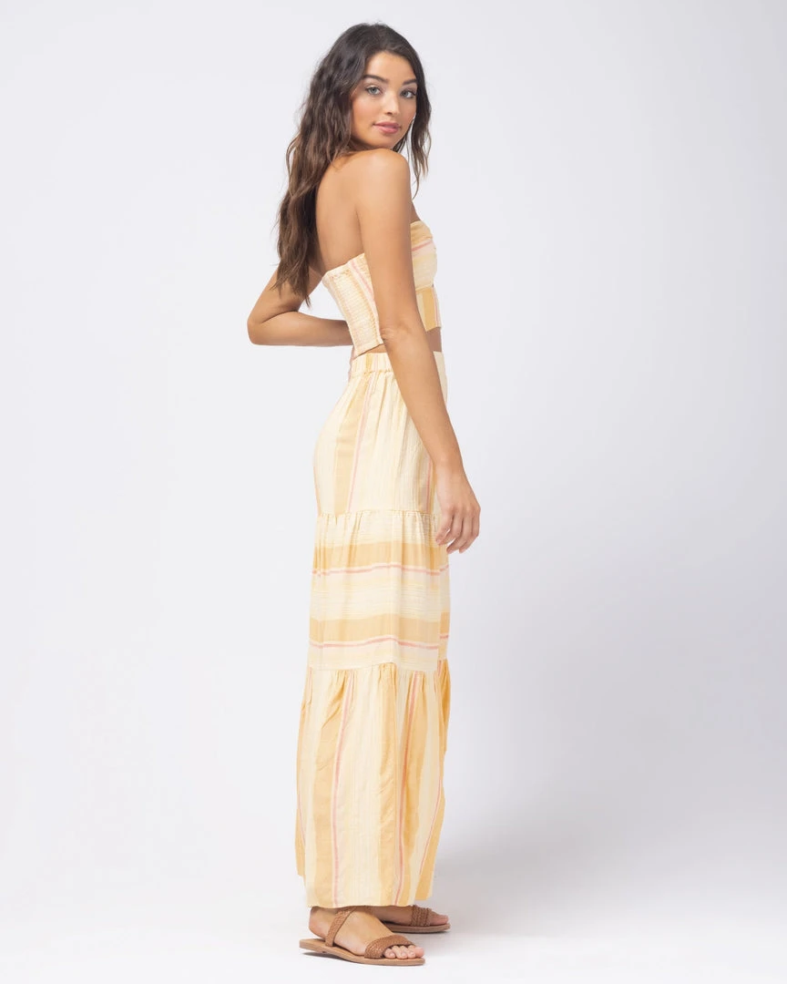 Glide through your day with the Bondi Skirt. This full length tiered skirt delivers with a high waist and flat front waistband, elastic waistband in the back, and is designed from Cozumel Stripe yarn dye fabric. Match her with our Blue Skies Tube Top, and the sun will be calling you by name.