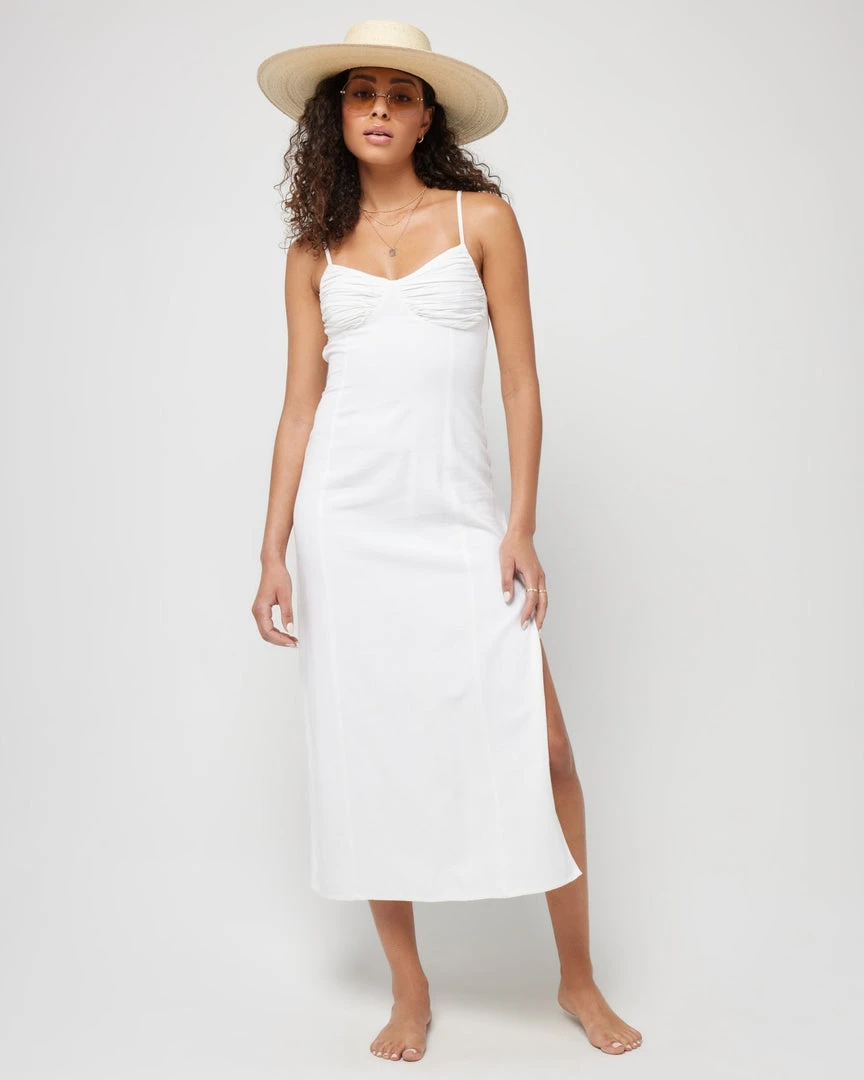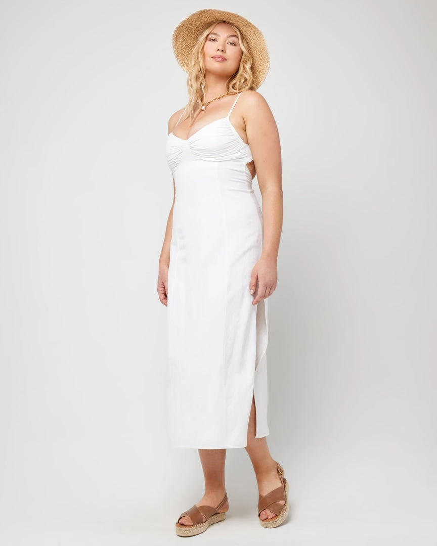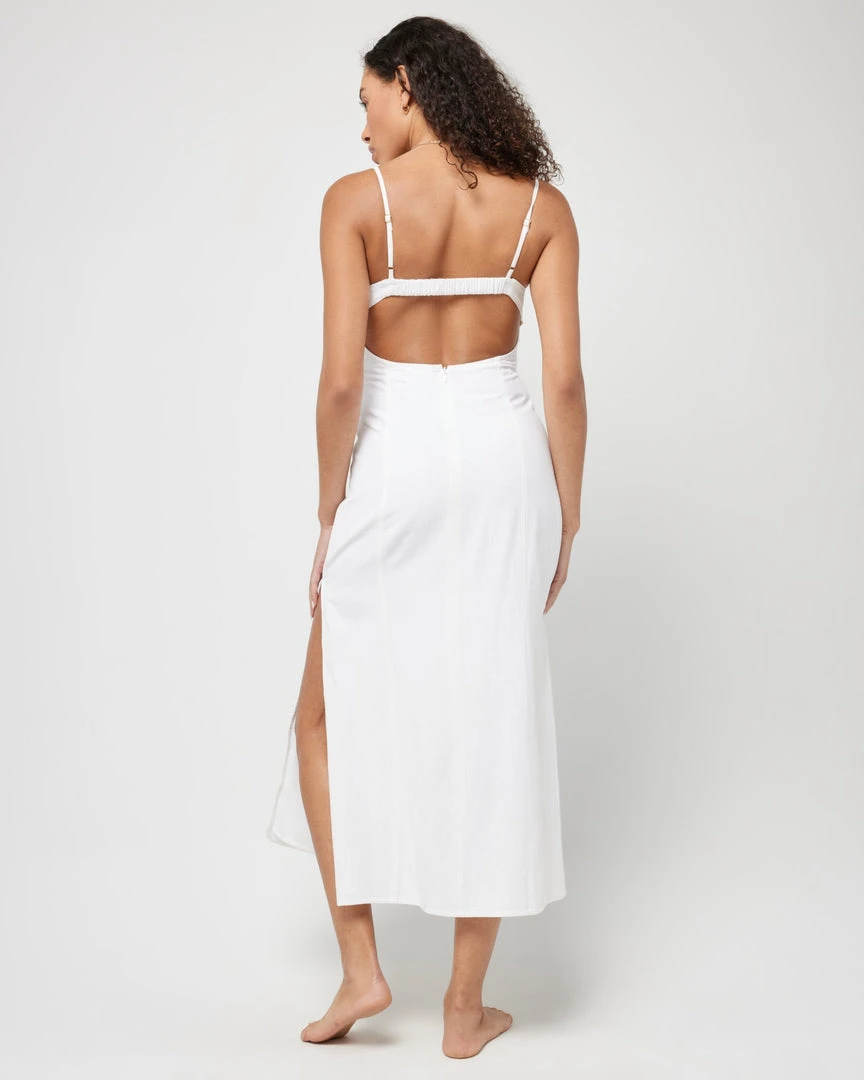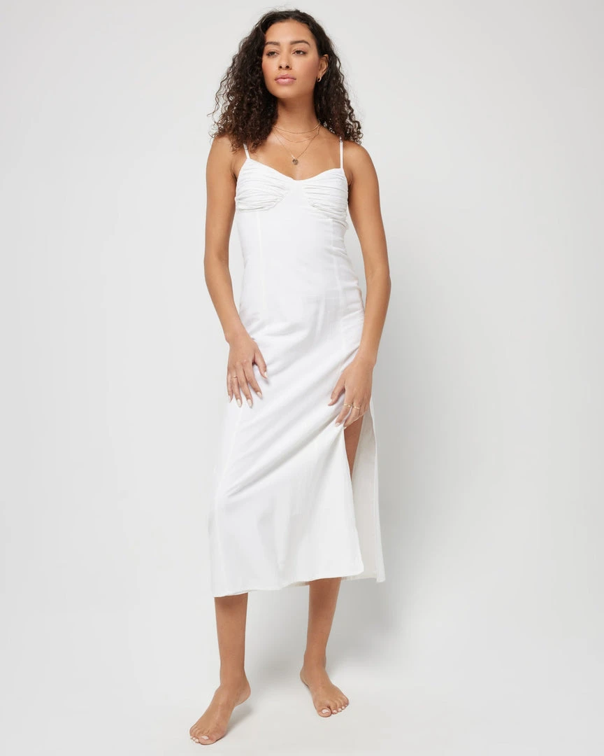 A simple yet sexy solution to what to wear for a night out comes in the form of the Dahlia Dress. This ankle length dress with slit features princess seams, fixed shirring at cups and adjustable slider straps with an elastic detail and cutout across the back.