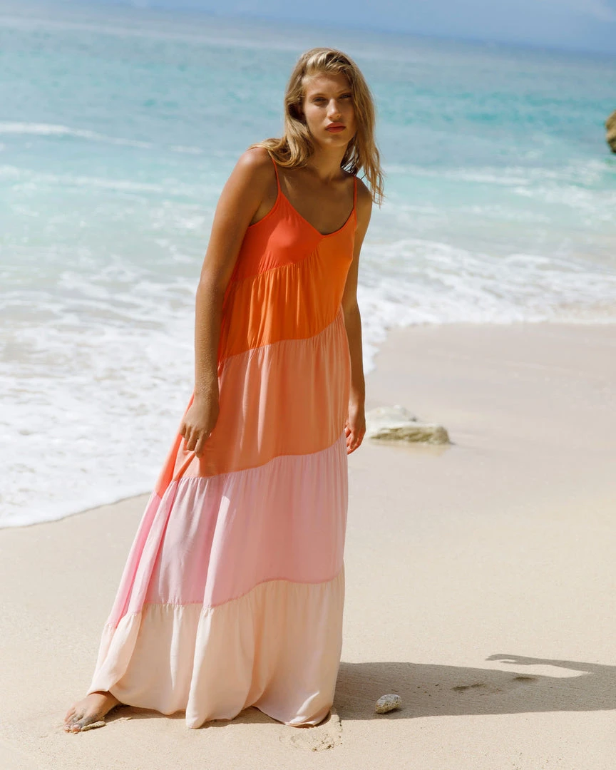 Bring the volume this summer in the Leona Dress. Easy to wear and even easier on the eyes, this voluminous maxi dress with asymmetrical tiers and ombre colors features spaghetti straps with adjustable slider straps and a tie at back with cutout.