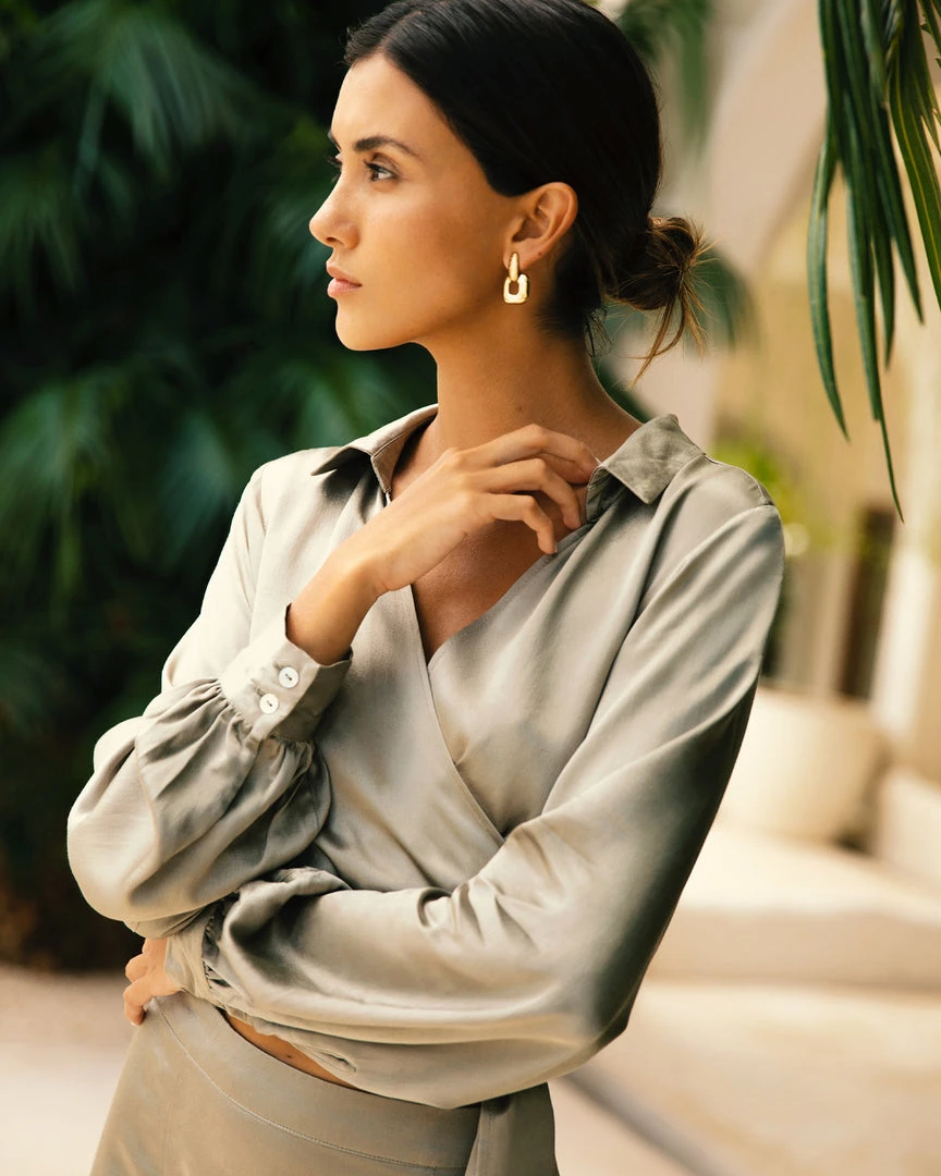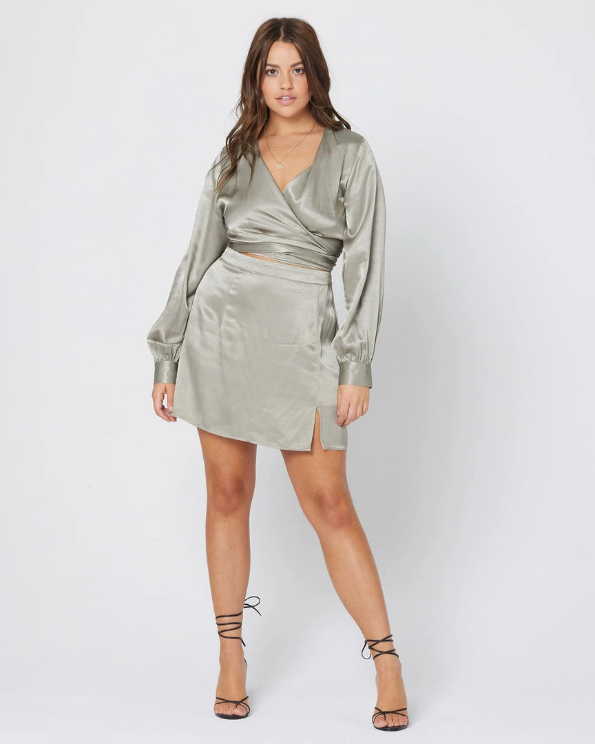 California girl goes glam in the girl’s night out approved Gwen Top. Designed in the prettiest olive green satin fabric, you’ll turn heads in this cropped wrap top featuring an on-trend balloon sleeve and buttoned cuffs. Pair with your favorite pair of jeans for a casual or with our Delta Skirt for the perfect holiday party ‘fit!