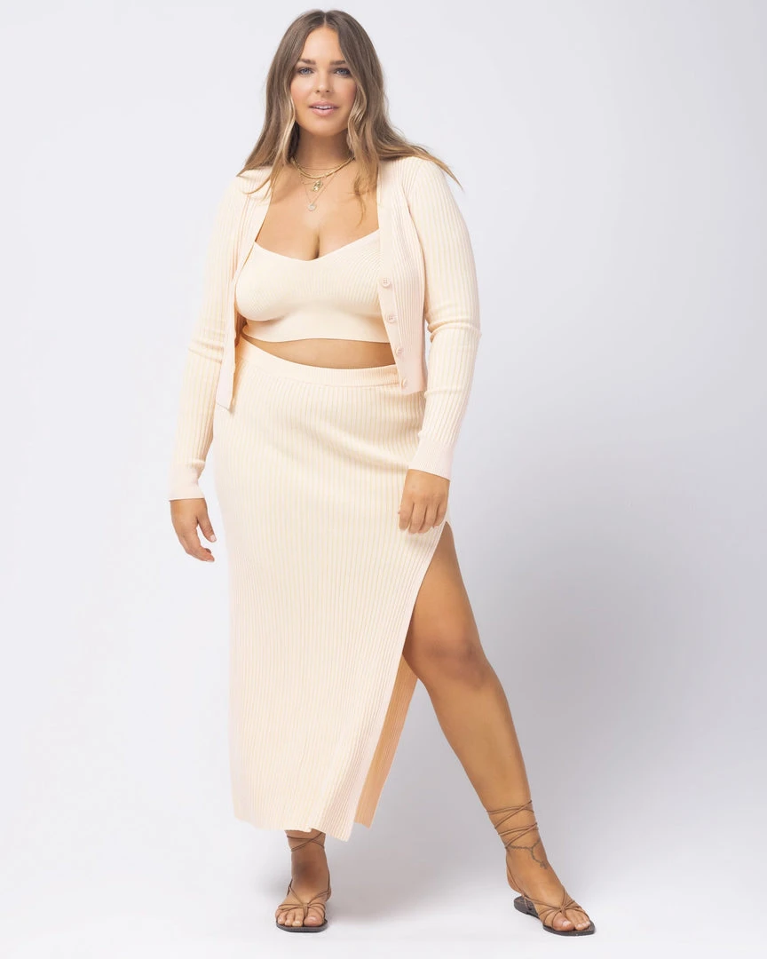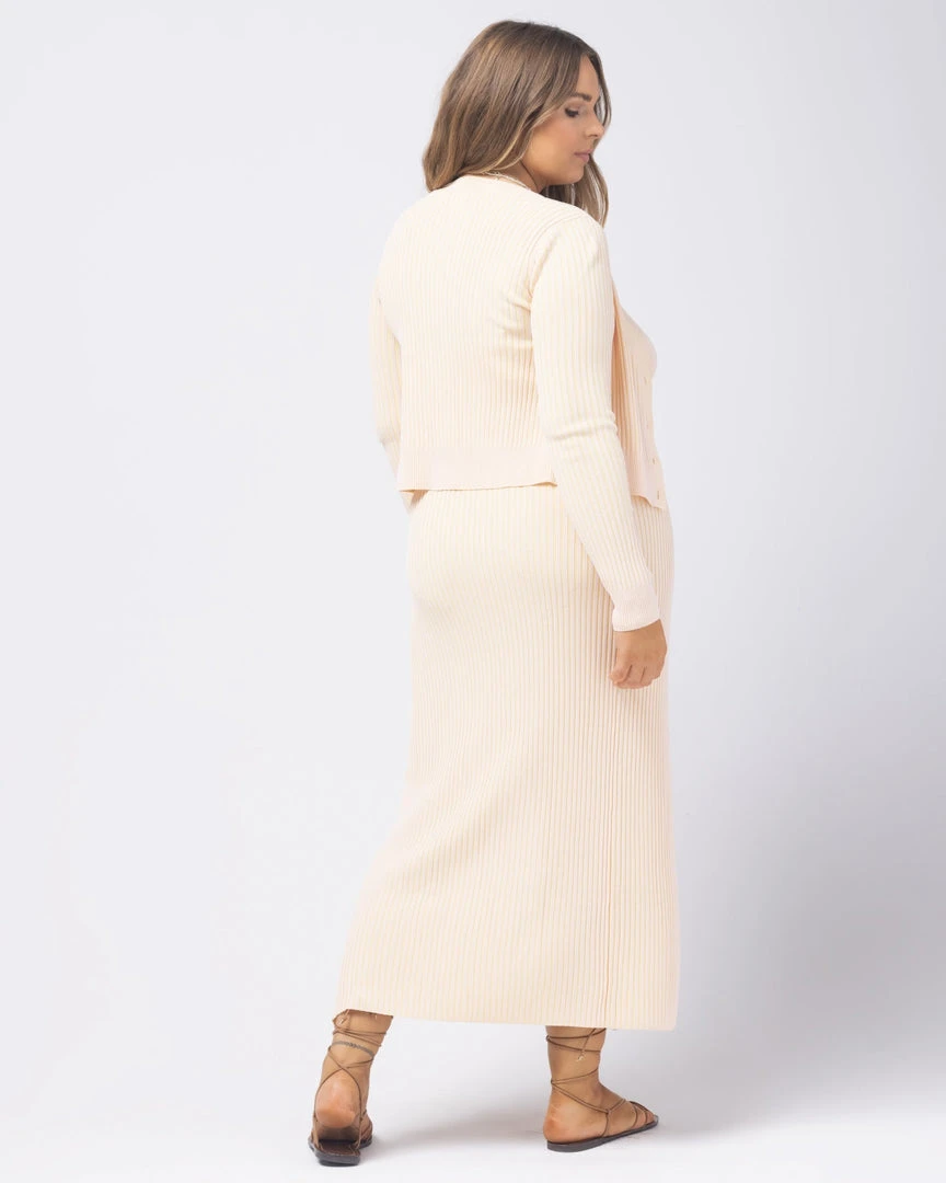 For those twilight times, keep yourself comfy with the Sundown Cardigan. Throw it on over a camisole or tee, this soft two tone rib cardigan with a shrunken silhouette has slim long sleeves and tortoise buttons.