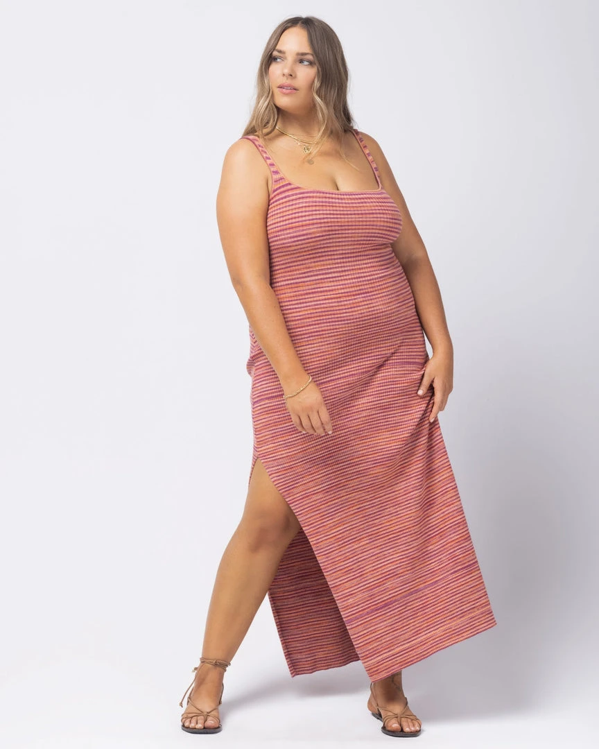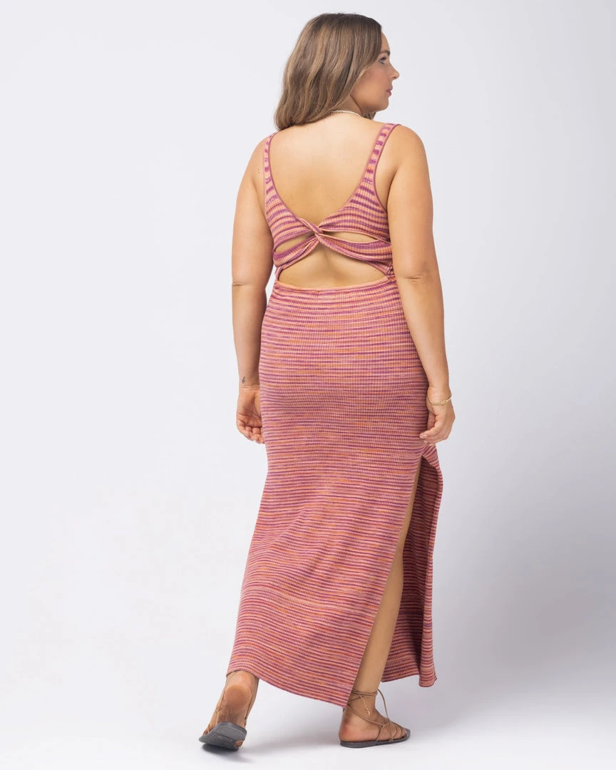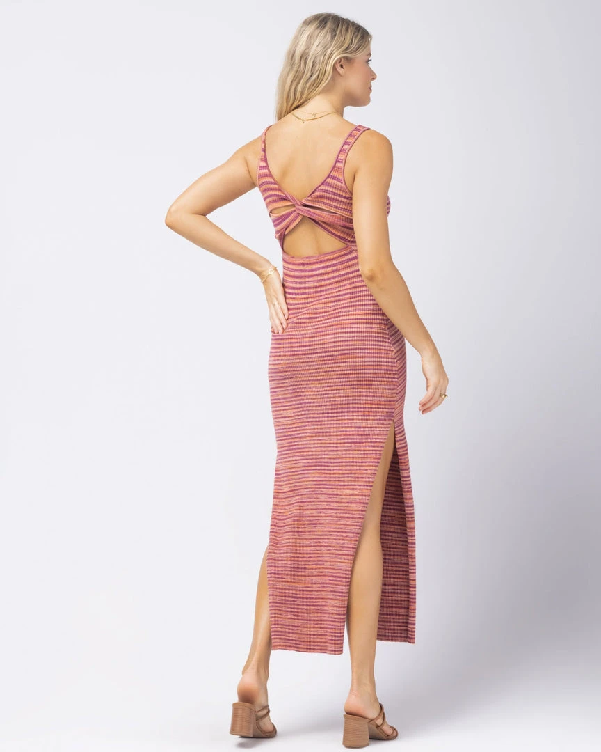 Paired with tennis shoes or heels, the Mara dress will have you going from day into night with absolute ease. This knit maxi dress, crafted from marled yarn dye, includes a scoop neckline, back cut out with twist detail, and high slits..