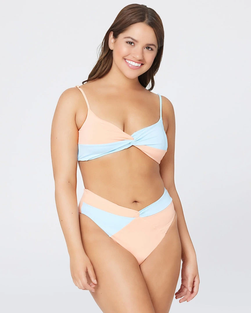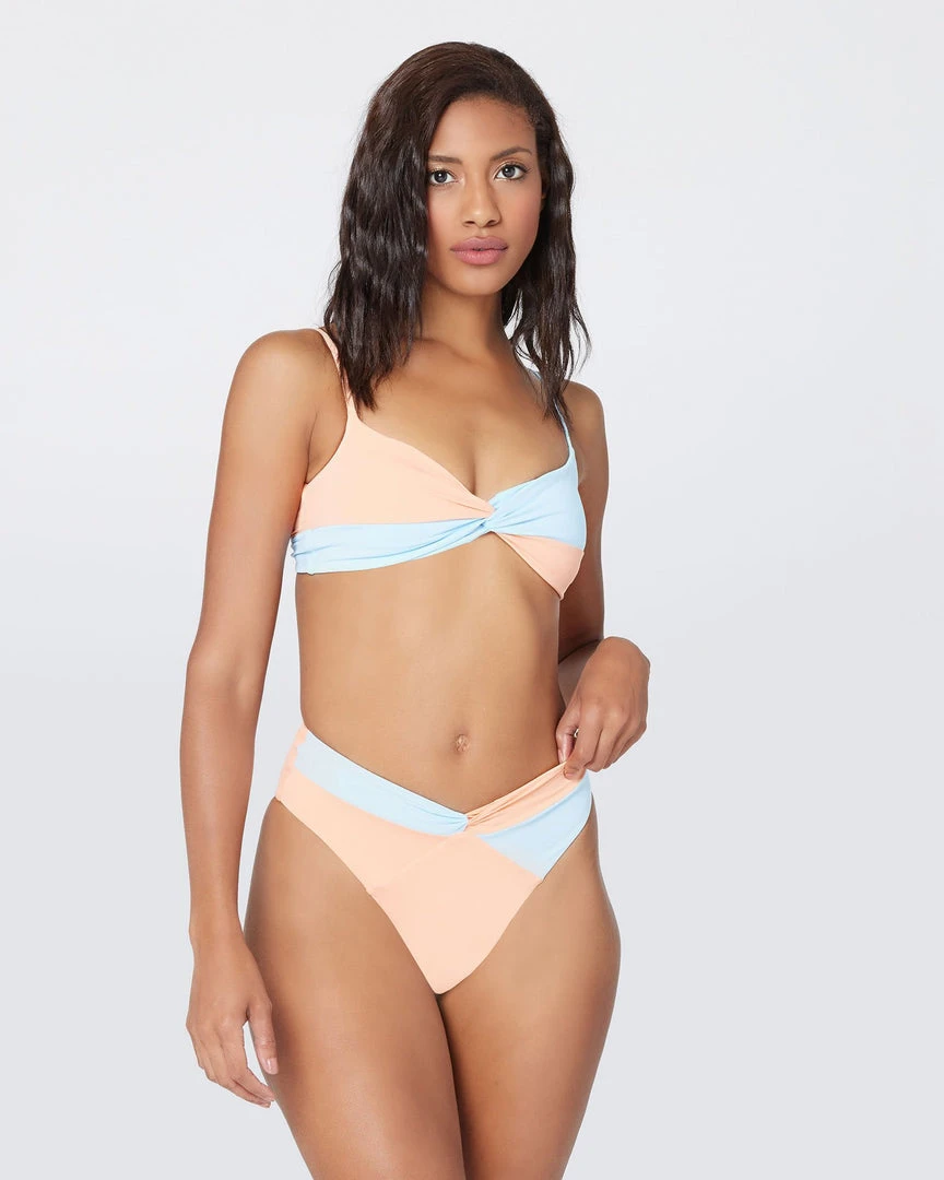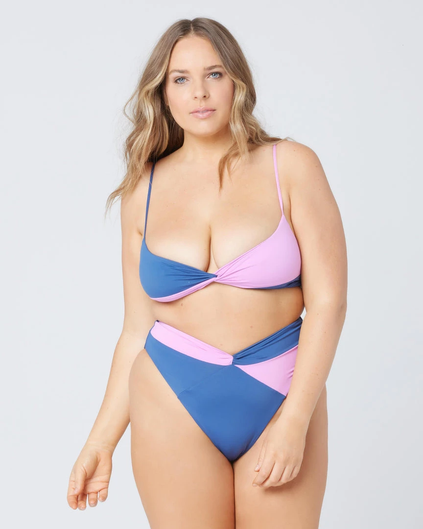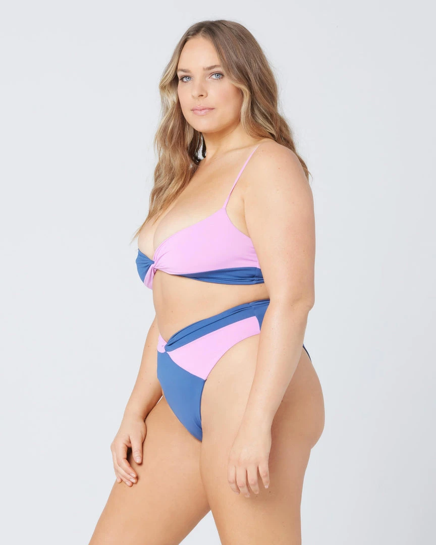 The Nancy Lee is a vintage-inspired bottom with bold color blocking and a twist front detail. A high waist is balanced with a sexy high cut leg and bitsy coverage!