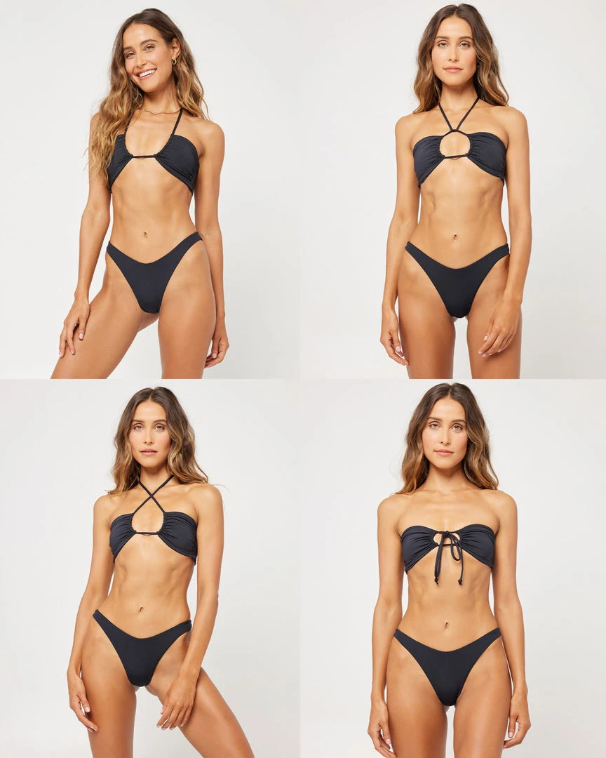 Free up your shoulders in the Dawn Bikini Top. This bandeau top, with its multi way wear and adjustable ties, is constructed with a keyhole in the front, and will have you turning heads all the way to the water.