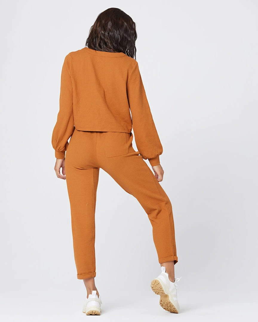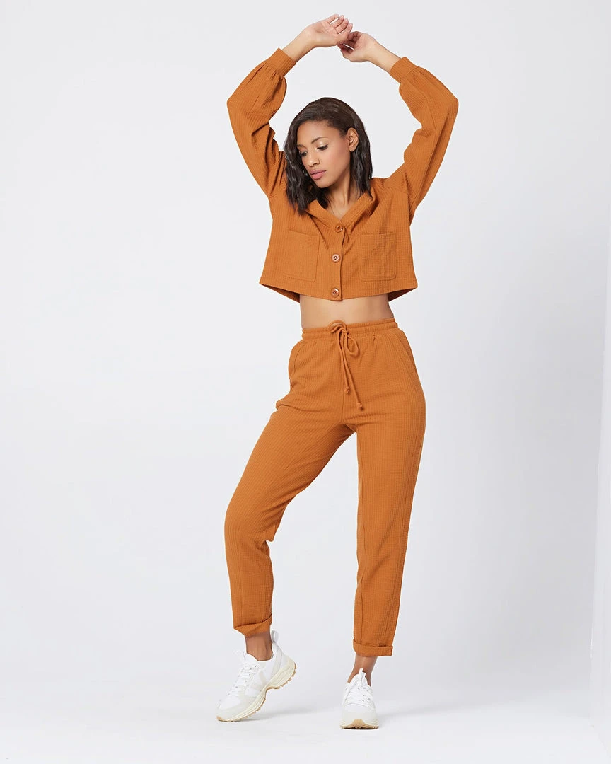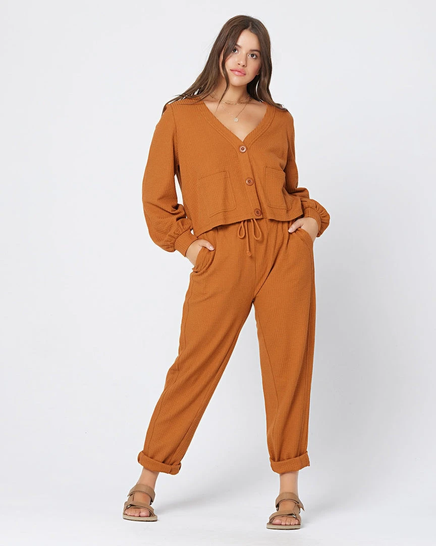 Terry cloth is back in a big way with the Dune Pant. These soft and cozy pants feature cropped + cuffed legs, an elastic waist with drawstring detail, and side slit pockets. Pair with the matching Romy Sweater for a seriously cozy look.