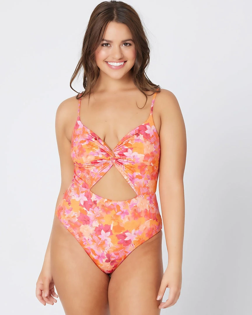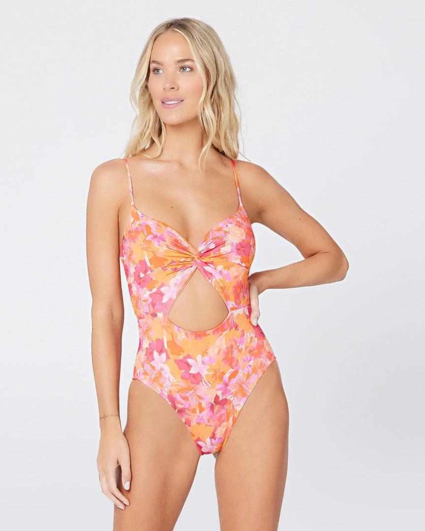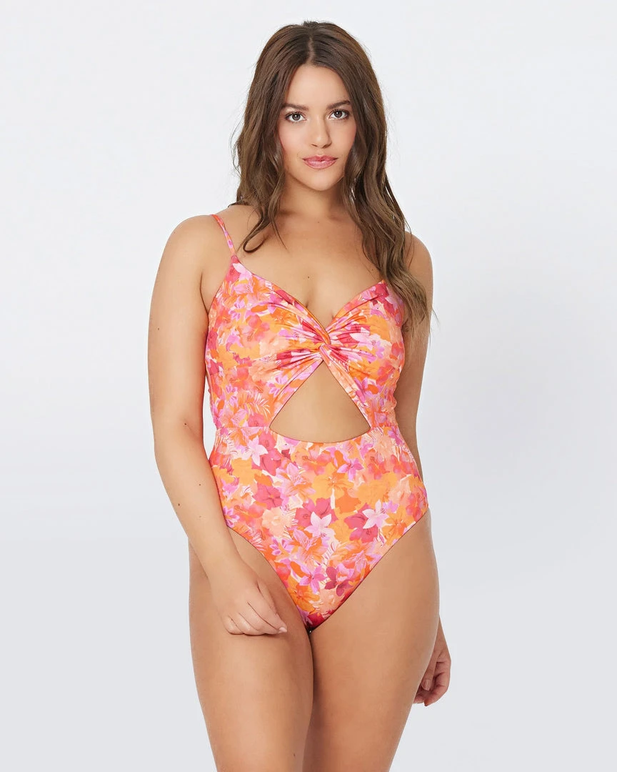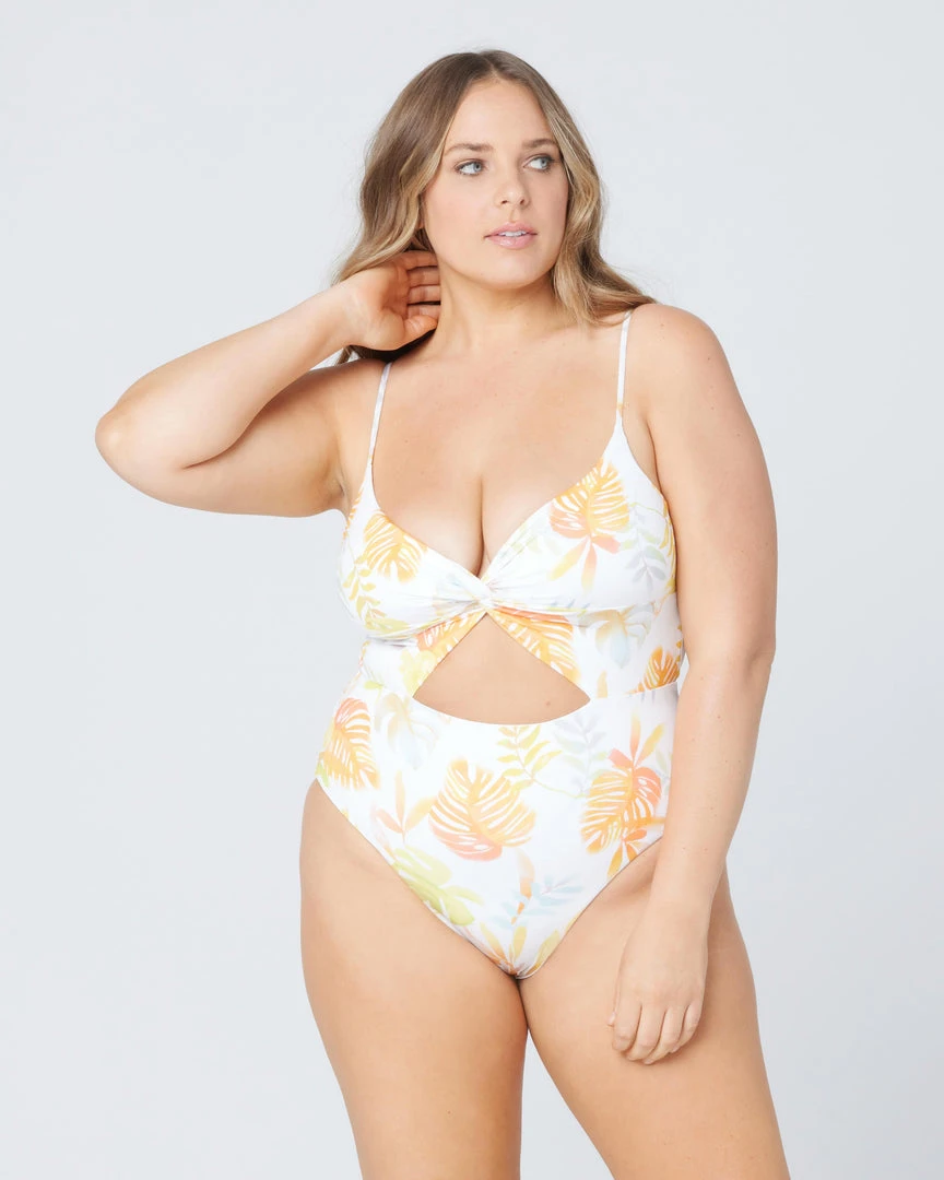 The Kyslee is all about the details with its front twist detail, tropical print, and 100% recycled fabric. A keyhole front and cut out back give this one piece a modern edge. Adjustable straps and a three-point back closure offer extra support.