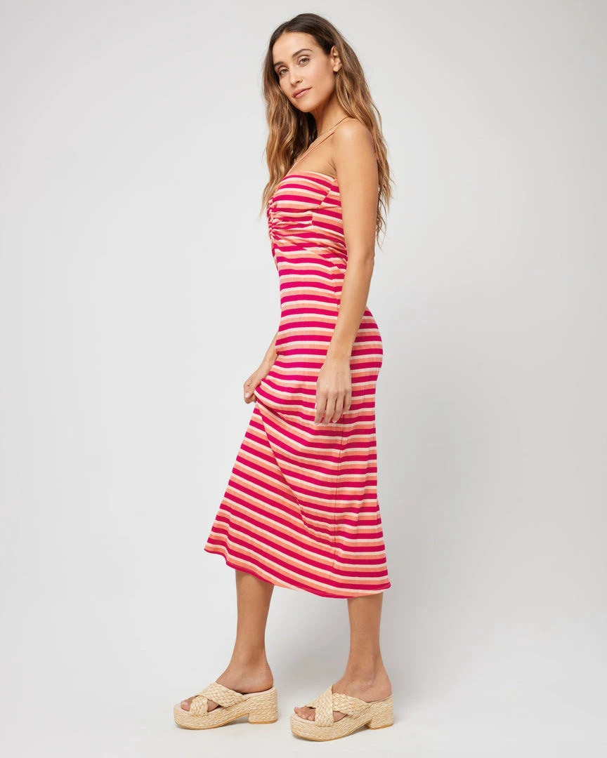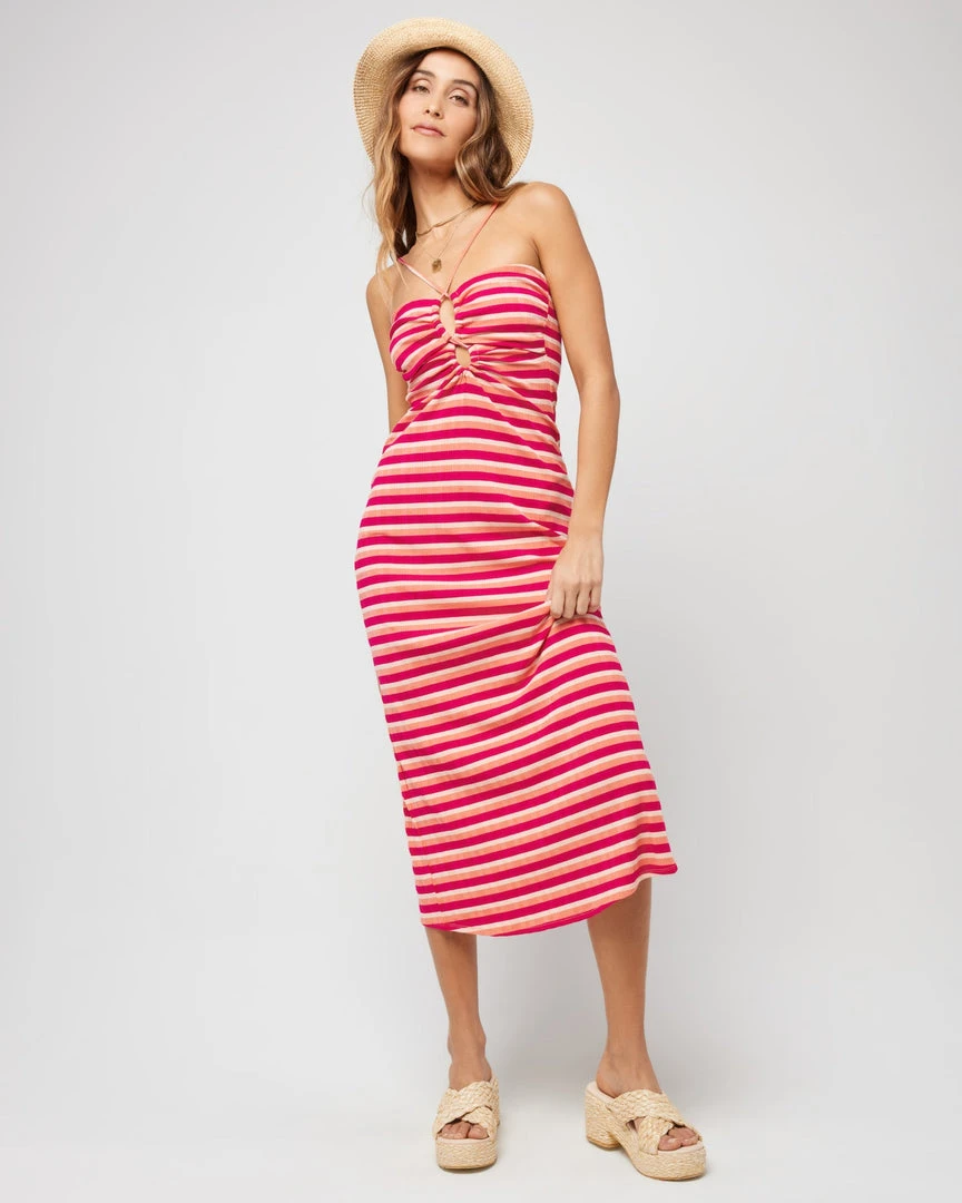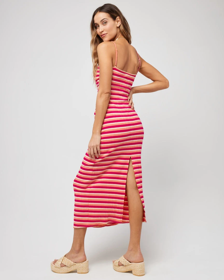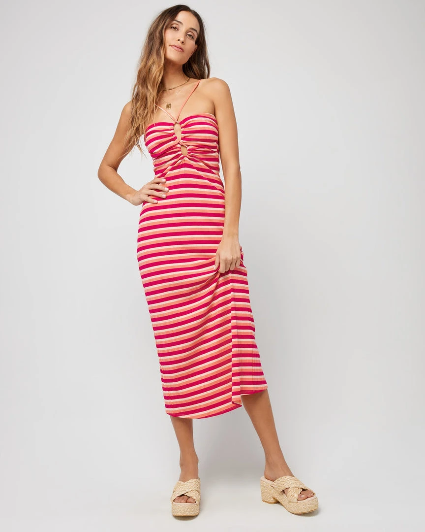 Show up in style to your next event in the Ellery Dress. Dressed up with heels or worn casual with sandals, this slim fitting varigated striped rib dress is designed with adjustable slider straps, a figure eight cutout center front and a center back slit.