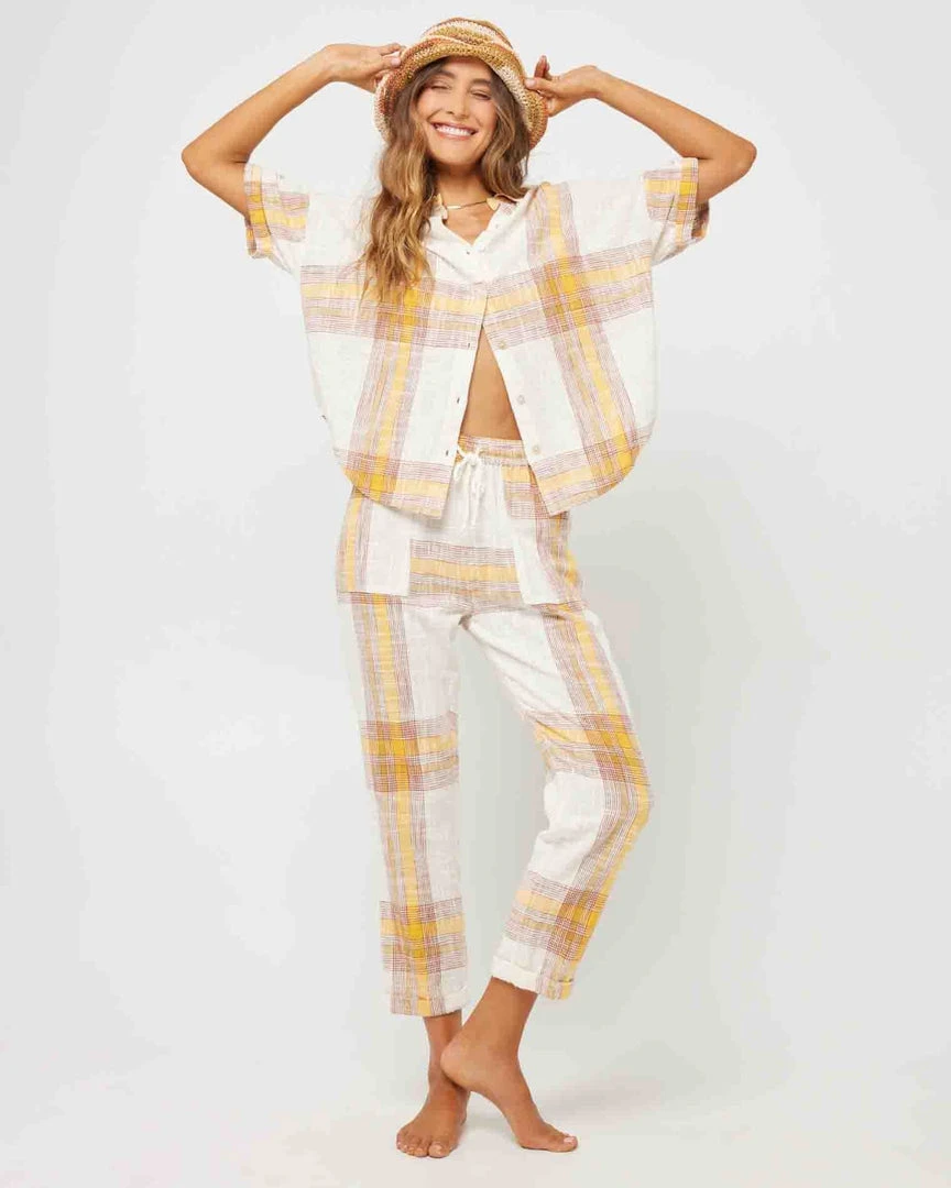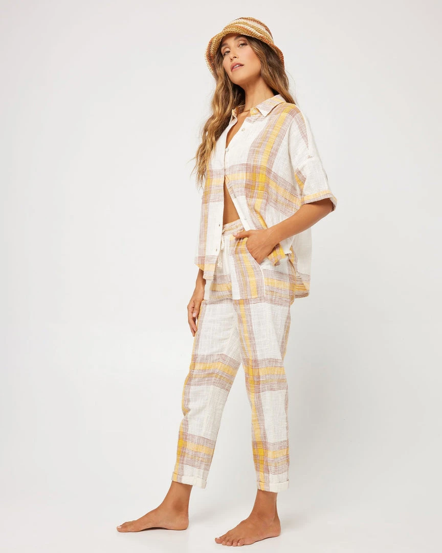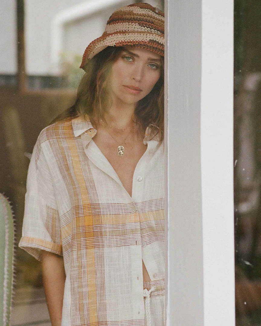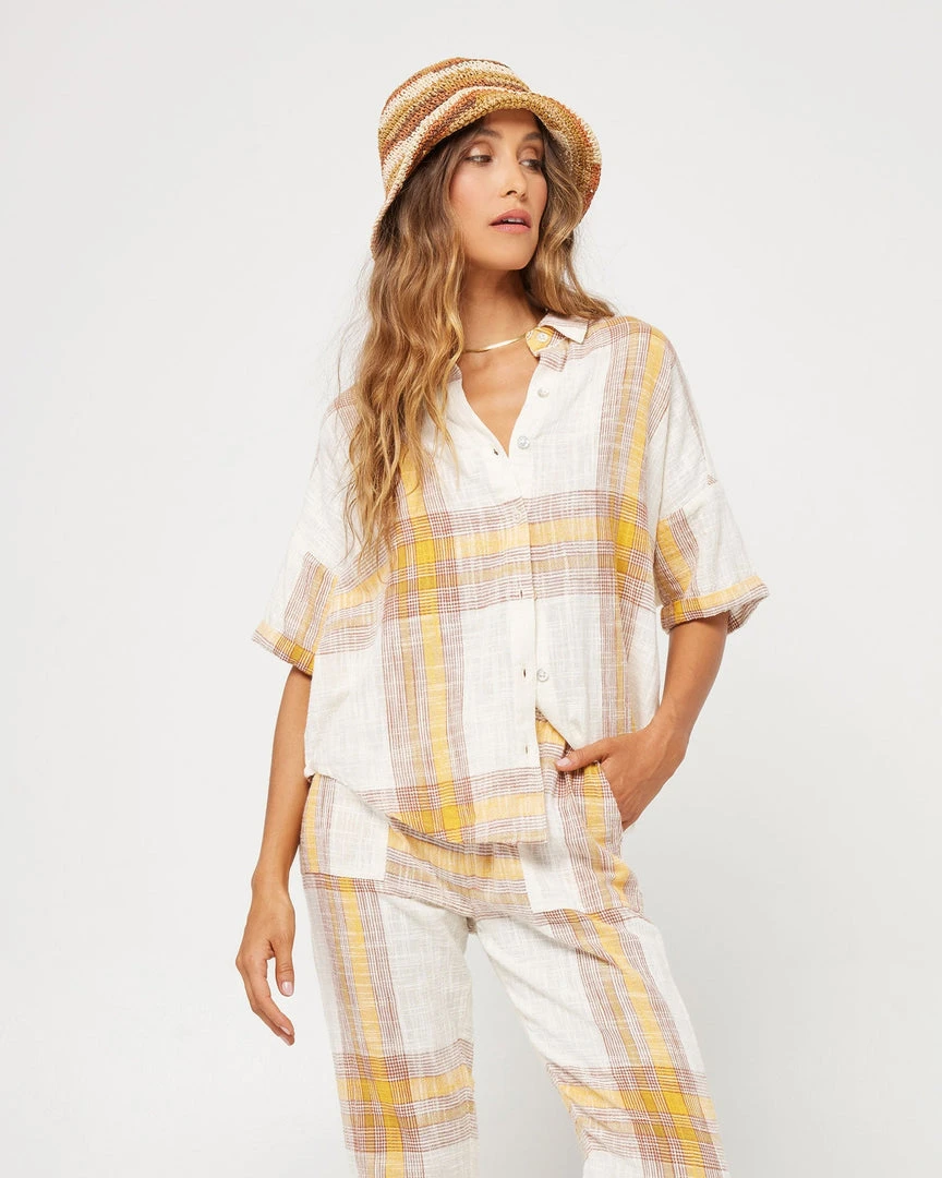 Keep the vibes light with the Isle of the Sun Top. Constructed from plaid fabric of the same name, this oversized button up collared shirt features rolled french cuffs and high-low shirt tail hem.