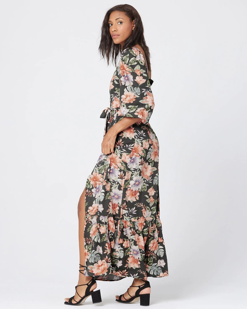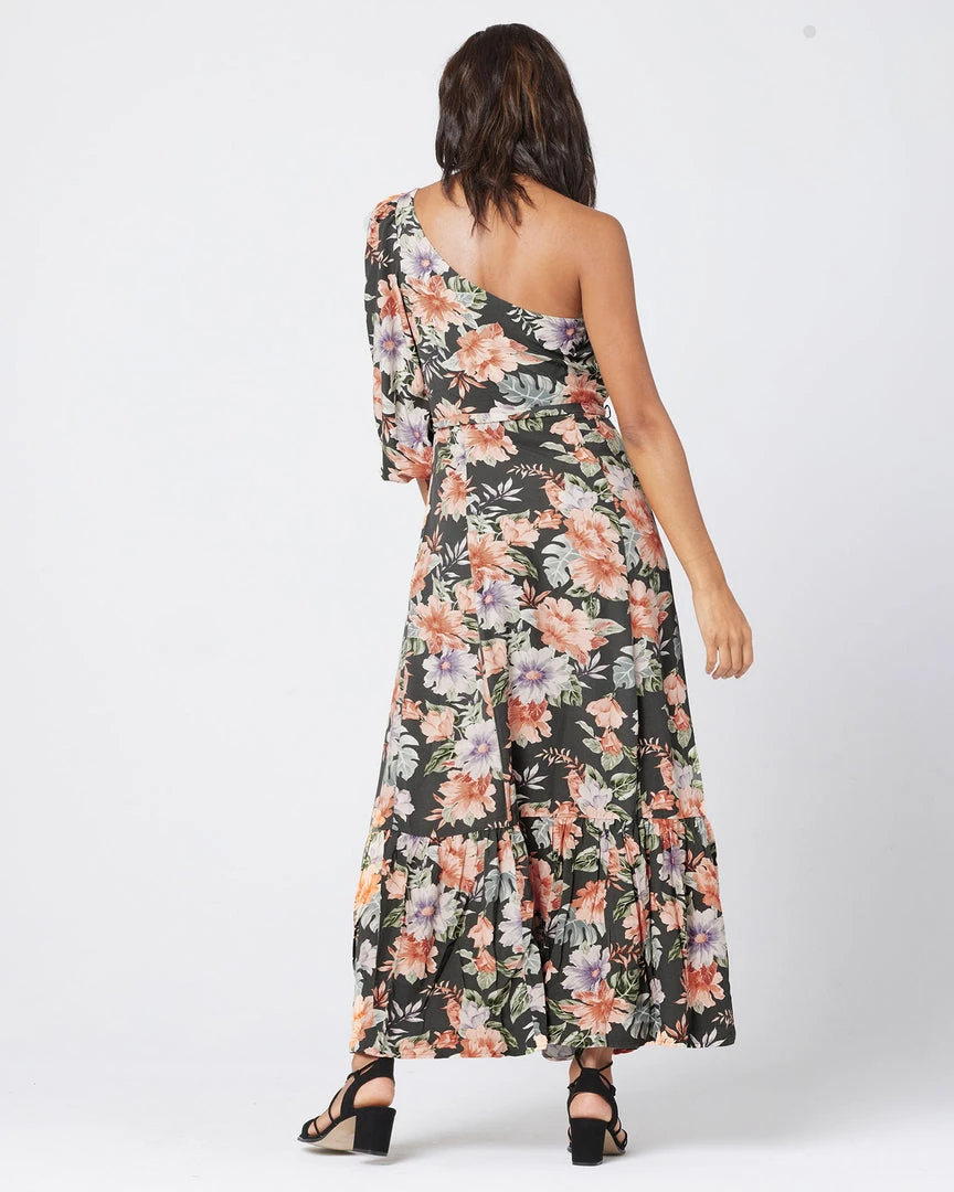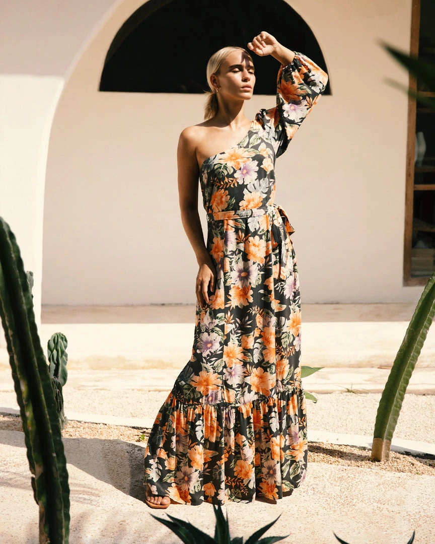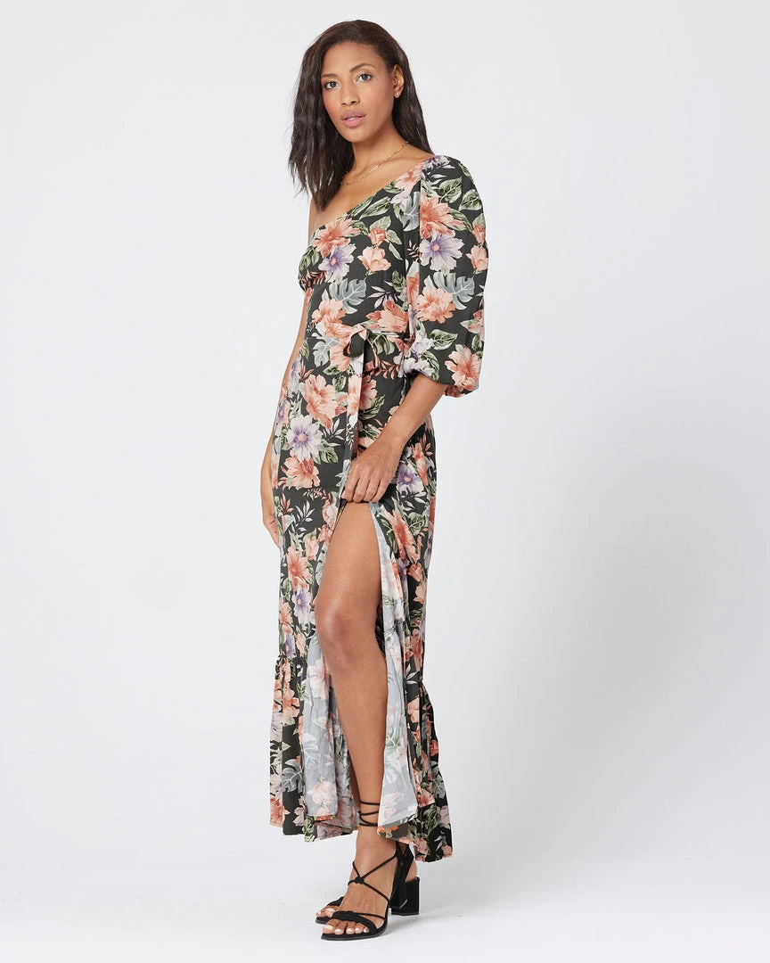 The Josephine Dress doesn’t disappoint. Made in our show-stopping moody floral print, your newest date night go-to features a one-shoulder puff sleeve, slit detail, and side zipper closure.