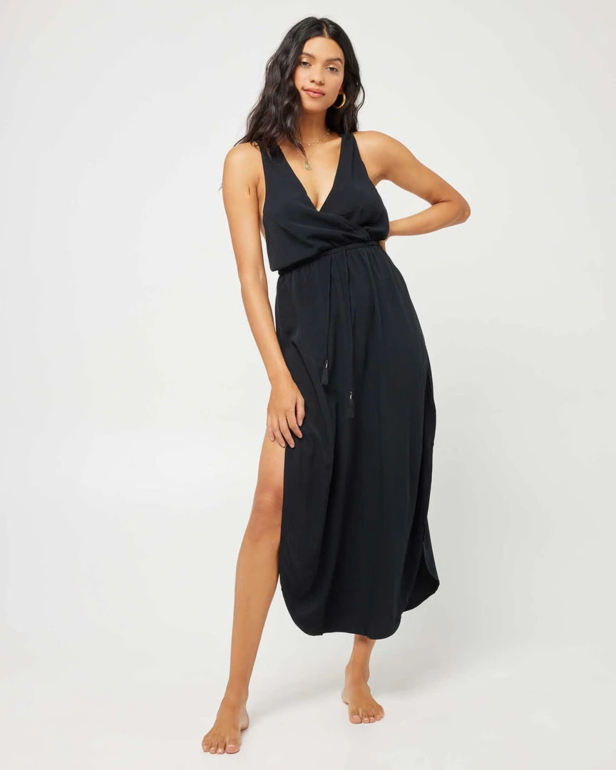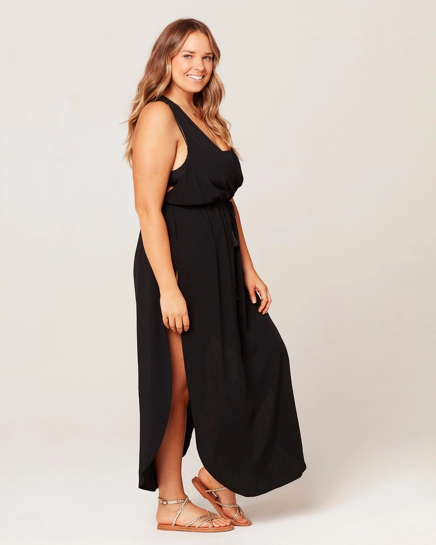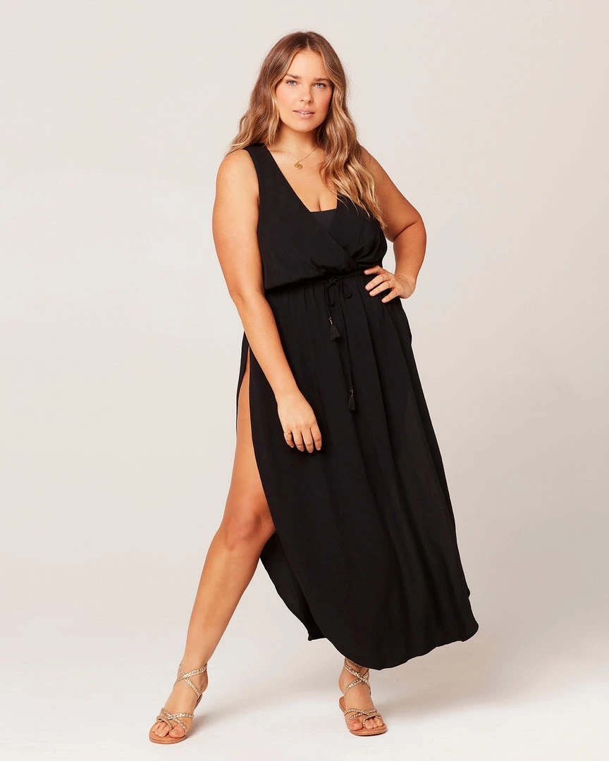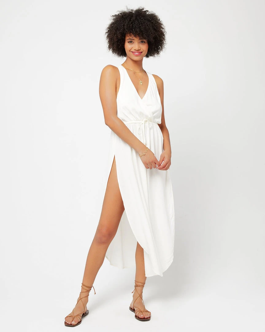 Say “hello sexy” in this high slit cover-up! Features a plunging V front with revealing sides to show off those catwalk, beach babe legs.