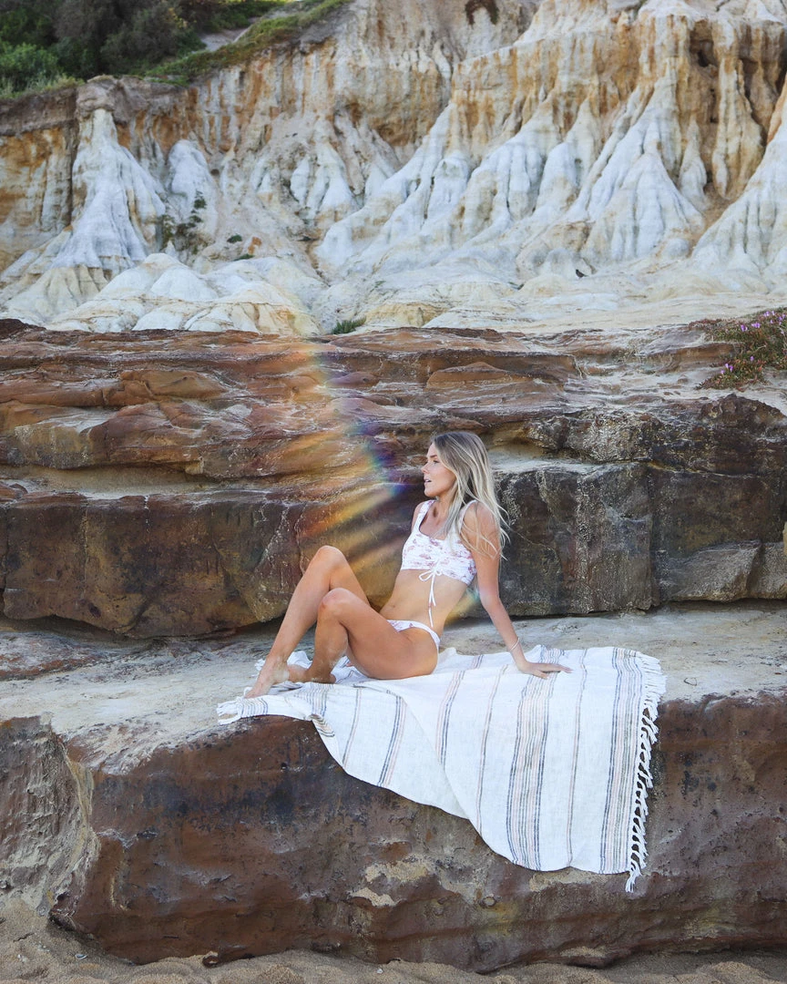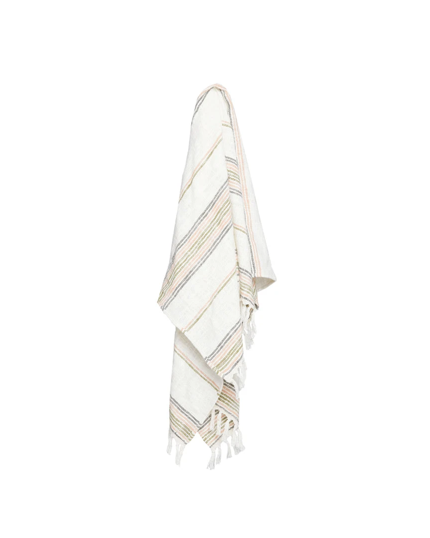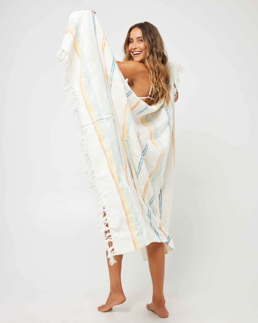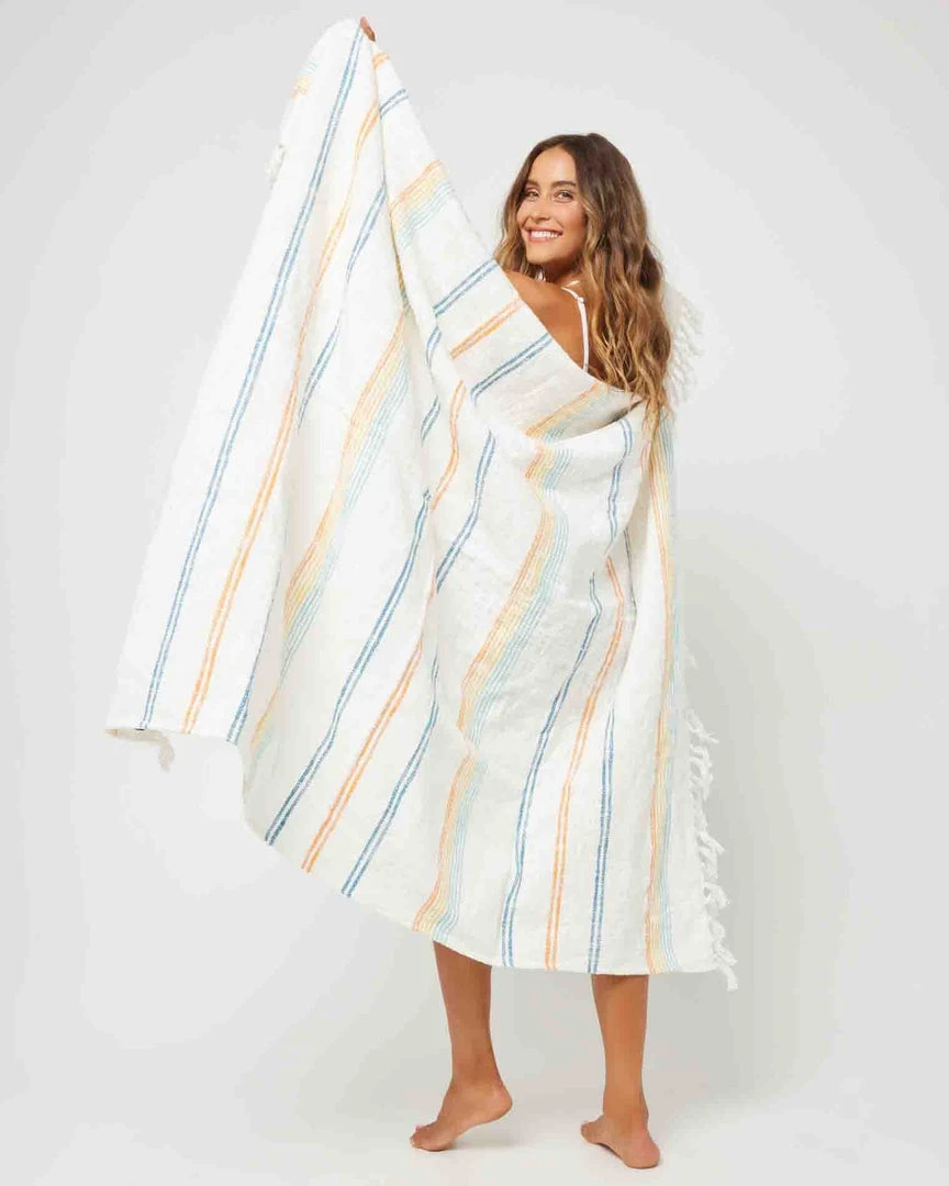 Oversized and soft, the Kimana Blanket is perfect for beach days or a picnic in the park. Features decorative tassels and a multicolor stripe pattern.