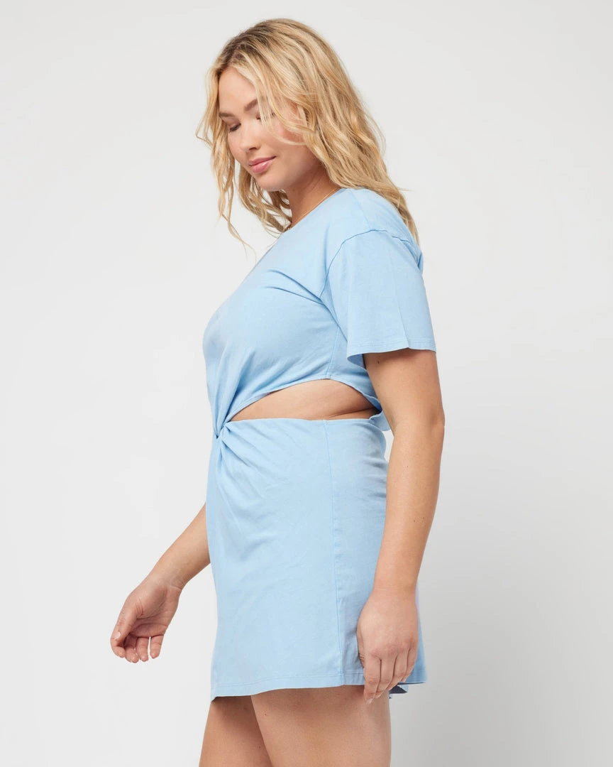 Minimal with some edge. The Lost Winds Dress is our play on the t-shirt dress, rendered from jersey with a ribbed neck band featuring cutouts on the sides and accented by a center front twist detail at the waist.