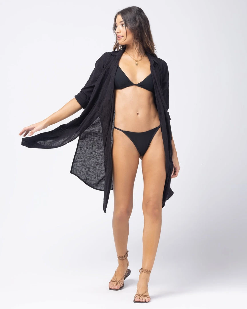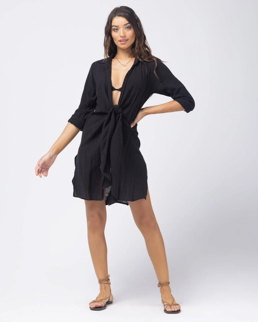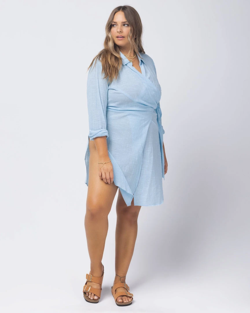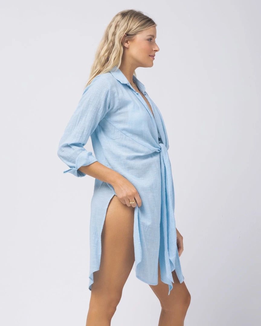Look fashionable even when covering up. The Palisades Cover Up is a midi wrap dress with collar that can be tied to the front or the side, slits along the side seams, and cuffs with shell buttons.