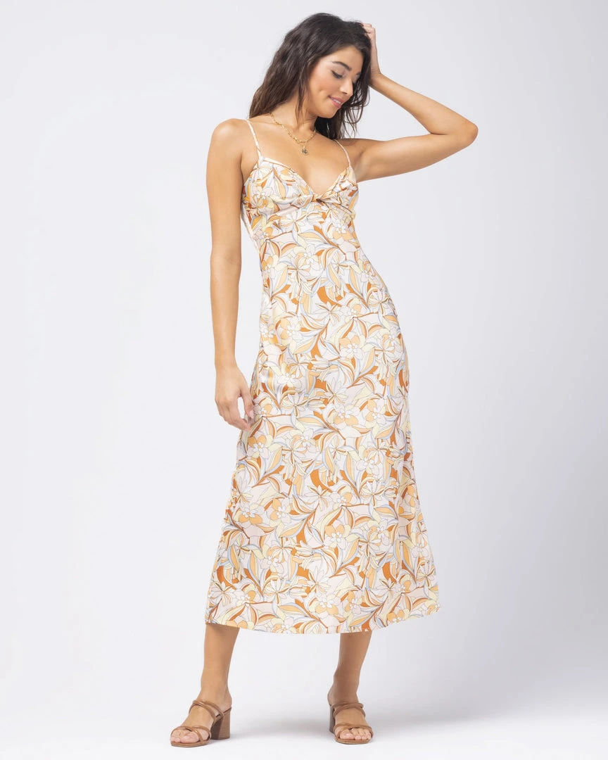 For those warm evenings out, keep it elegant with the Joanna Dress. This printed slip bias dress is designed with an empire seam at the under-bust and delicate spaghetti straps with adjustable sliders, and features a center front twist and keyhole for that extra bit of sexy.