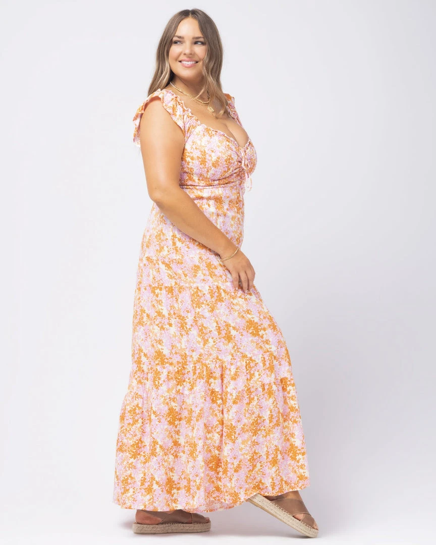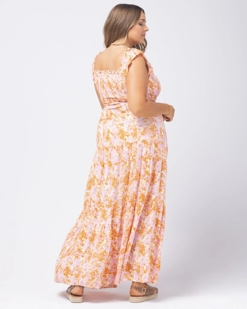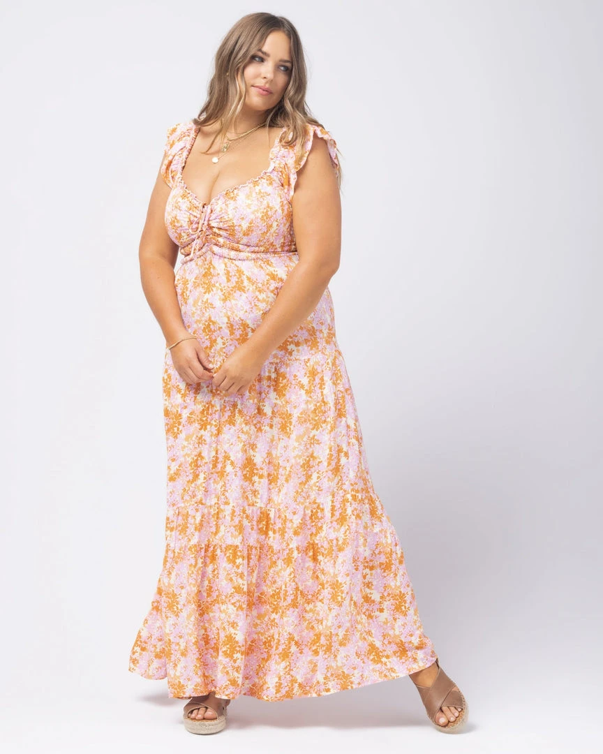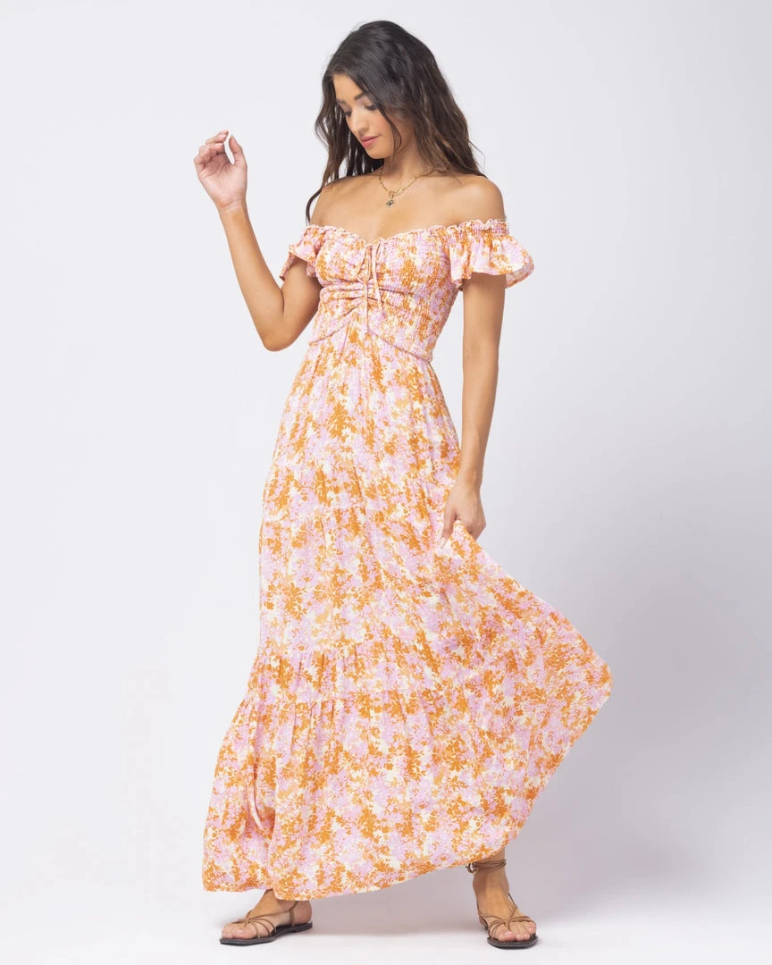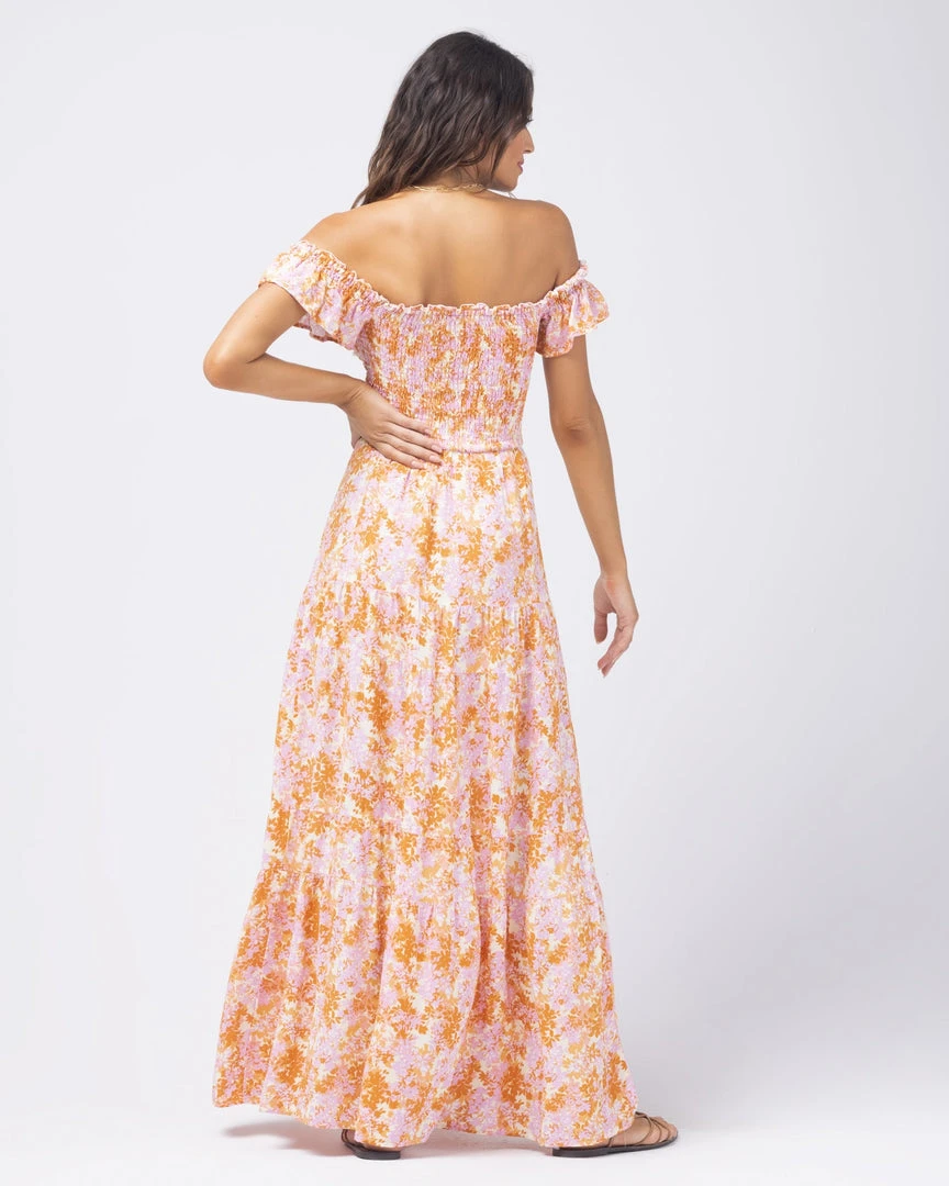 Get swept away in the Lucia Dress. From its off the shoulder ruffled sleeves to its smocked bodice, this maxi length dress with shirred tiers and functional drawstring for cinching will have you dressed for that summer romance.