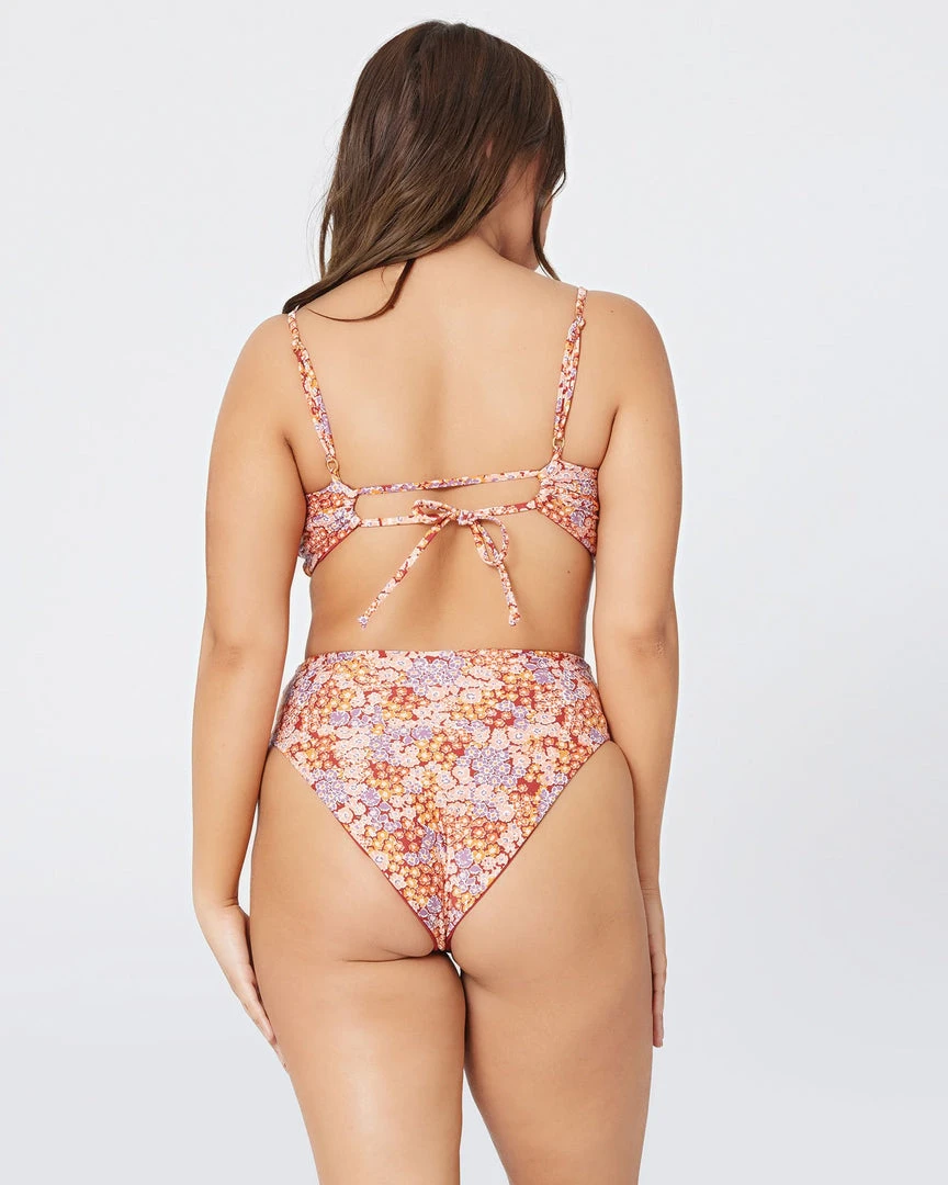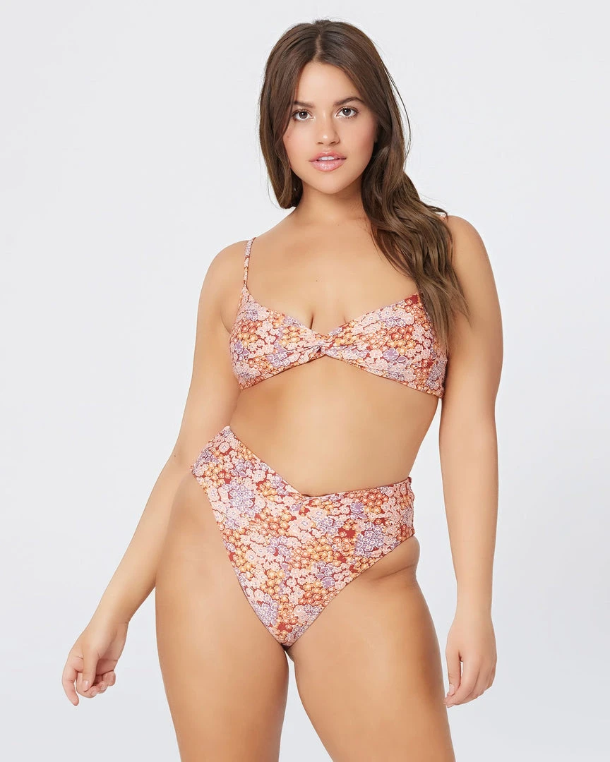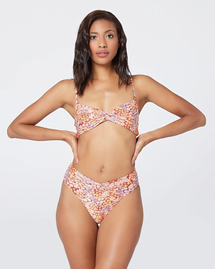 The Nancy Lee is a vintage-inspired bottom with bold color blocking and a twist front detail. A high waist is balanced with a sexy high cut leg and bitsy coverage!