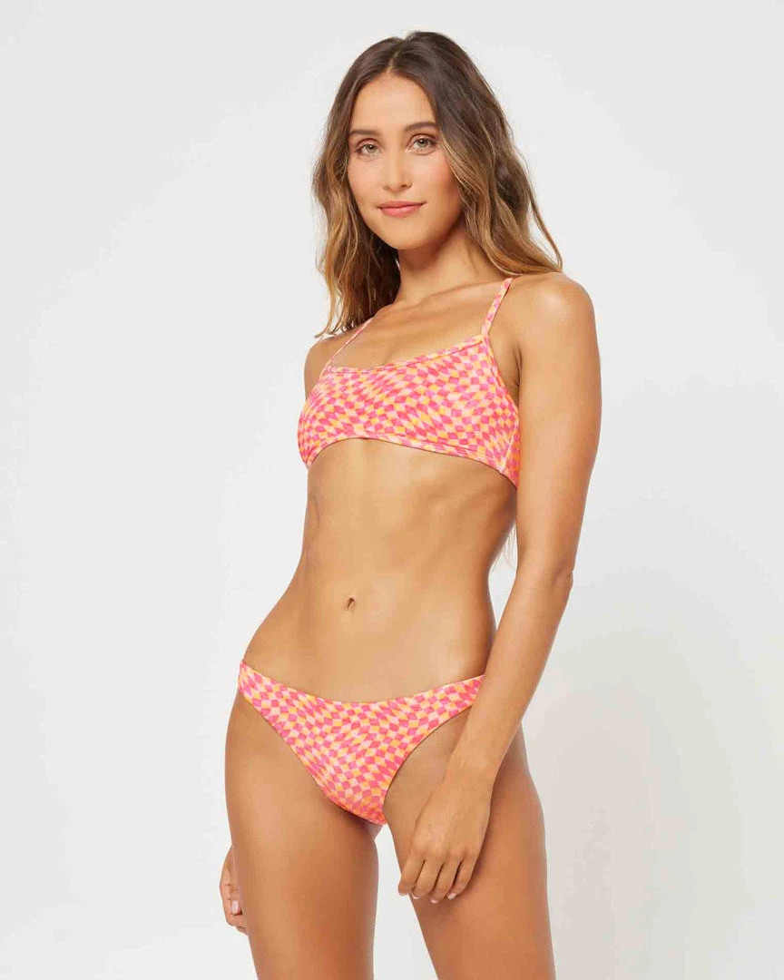 From the yoga mat to the beach towel, this racerback top with adjustable slider straps has got you covered. Crafted with a shine print, the Pamela Bikini Top also features a scoop neckline and removable pads.