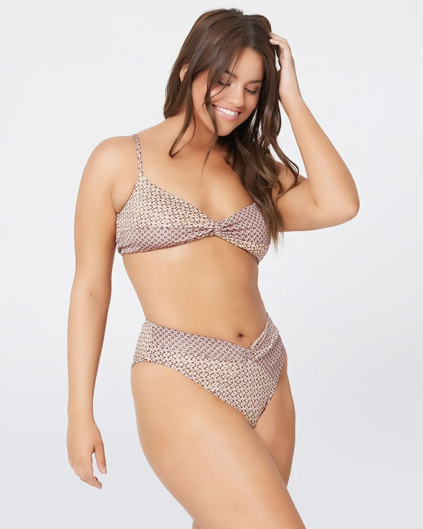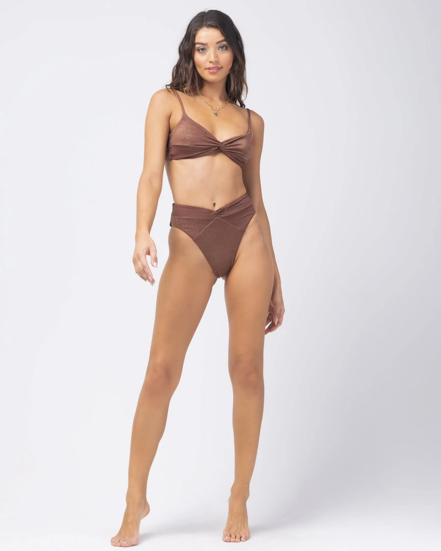 The Nancy Lee is a vintage-inspired bottom with shimmer color blocking and a twist front detail. This high waist style features a sexy high cut leg and bitsy coverage.