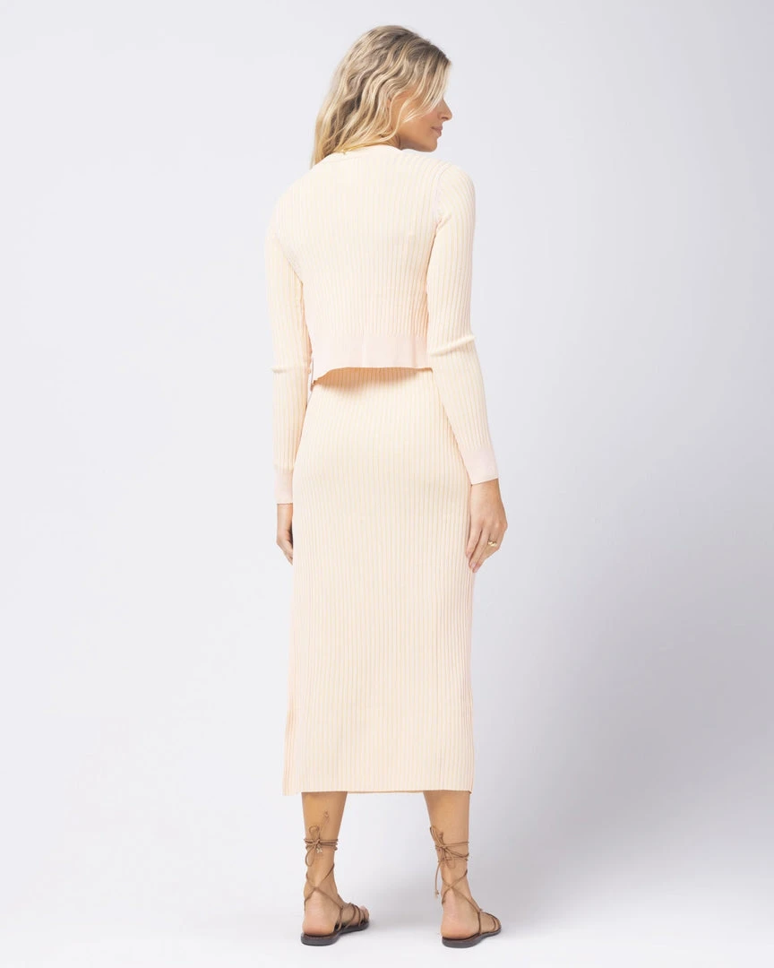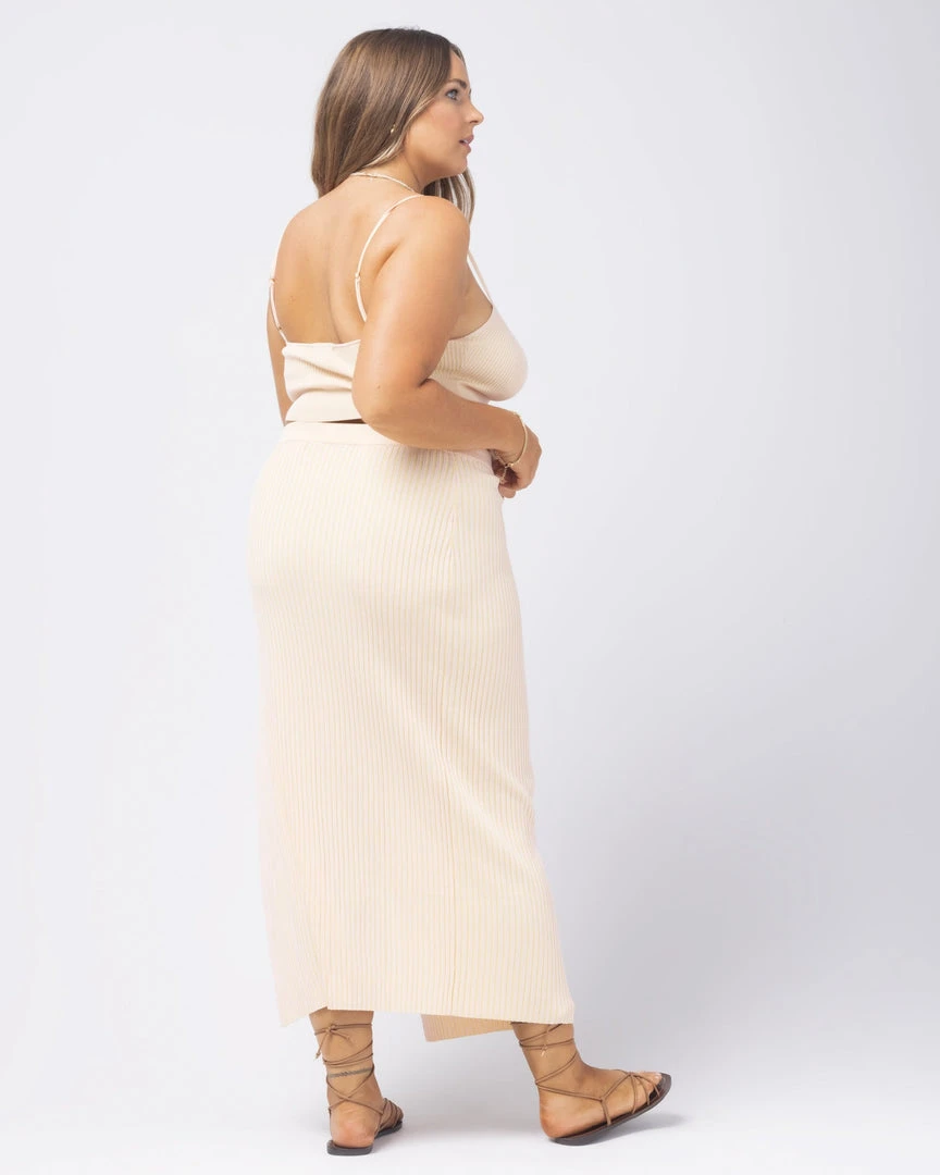 Show a little leg this season with the Sundown Skirt. This long, slim fit, two tone rib pencil skirt features a slit up the side, fitting for a sunset stroll or sipping your favorite beverage poolside. Pair it with the Sundown Top and accessorize for an elevated summertime look.
