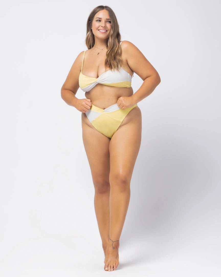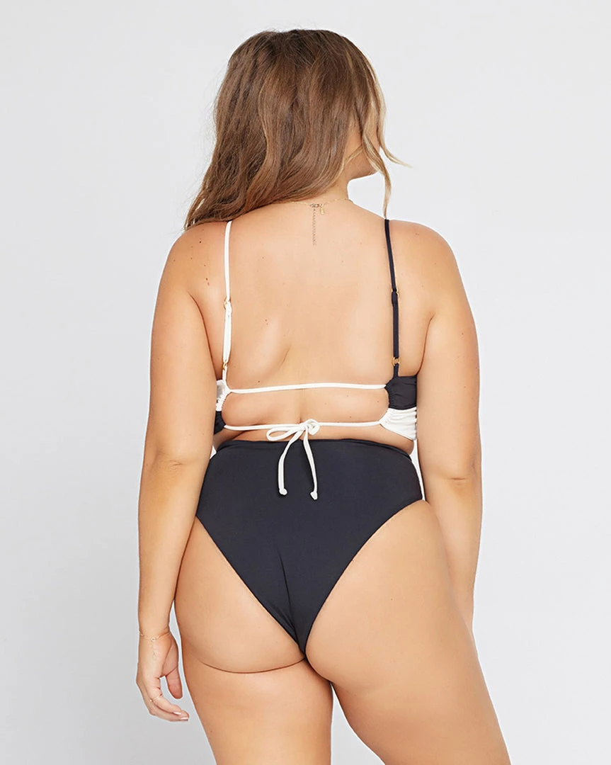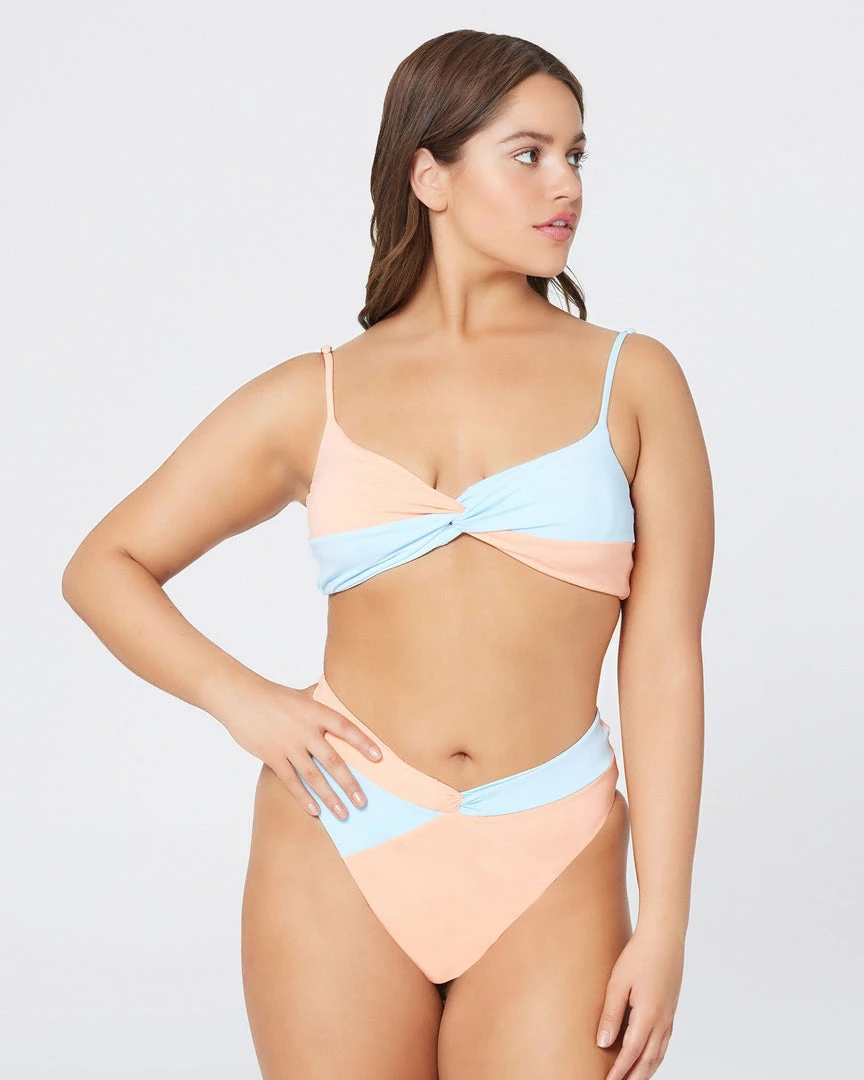 The Ringo is a vintage-inspired top with bold color blocking and a twist front detail. Features fully-adjustable back ties and straps.