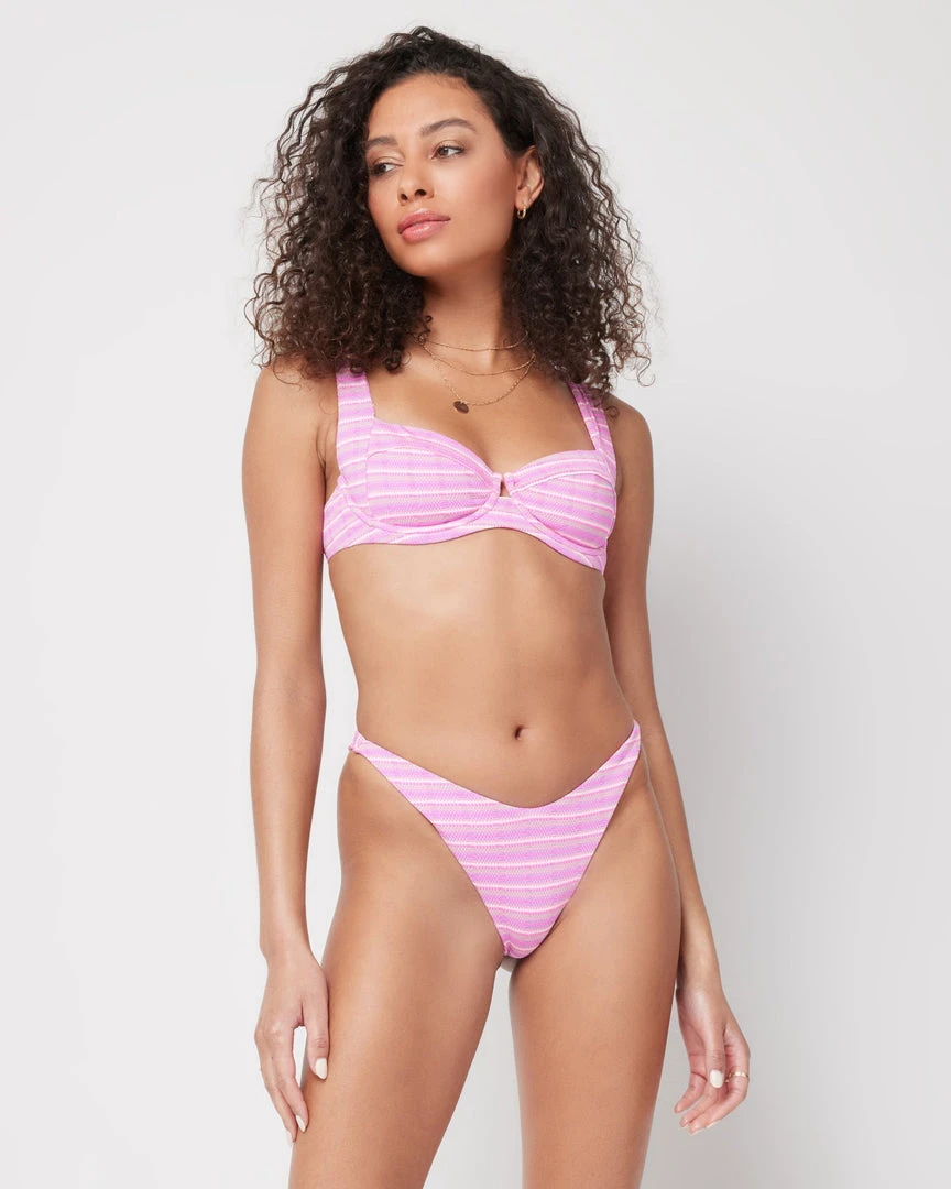 The bitsy bottom you love is back! The Cabana Bikini Bottom, with its high leg cut and scoop front, not only flatters this season in a pique stripe yarn dye material – it serves.