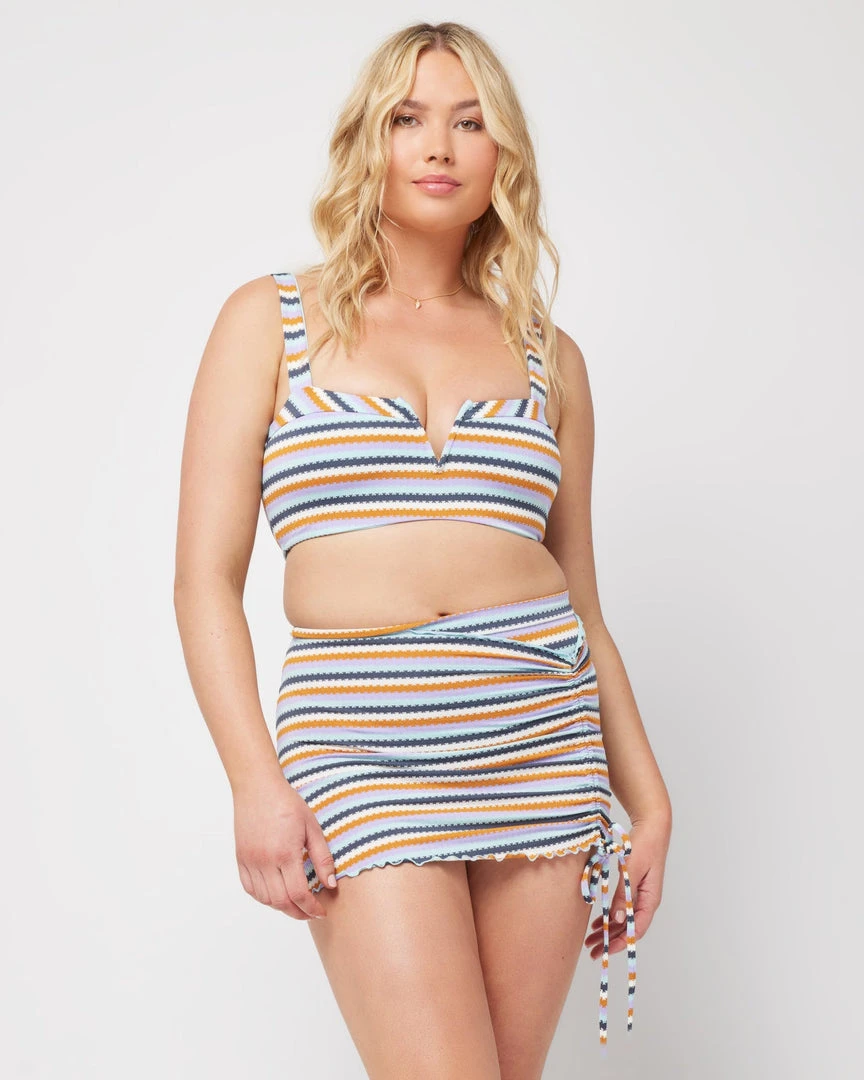 For those endless sunny days spent in AND out of the water, keep it cute in the Minnie Mini. Rendered from pique stripe yarn dye fabric, this lettuce edged swim skirt comes with a cinched adjustable side tie and plays perfectly with the Millie Top, or any top of your choosing.