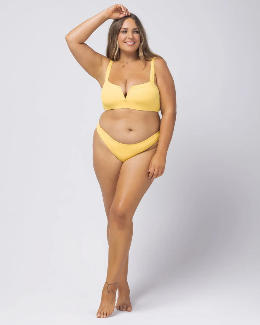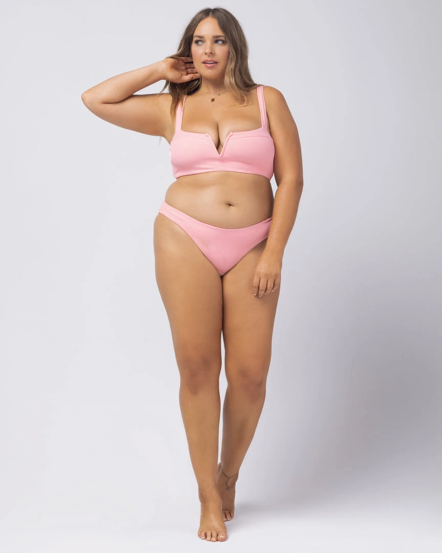 The Lee Lee features soft ribbed texture fabric and a sculptural silhouette. Offering comfy, moderate support. Lightly lined in our signature buttery fabric with wired V-neck detail at bust.
