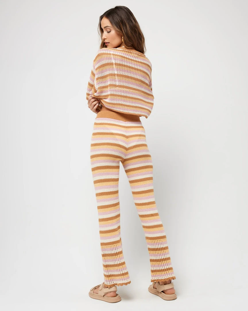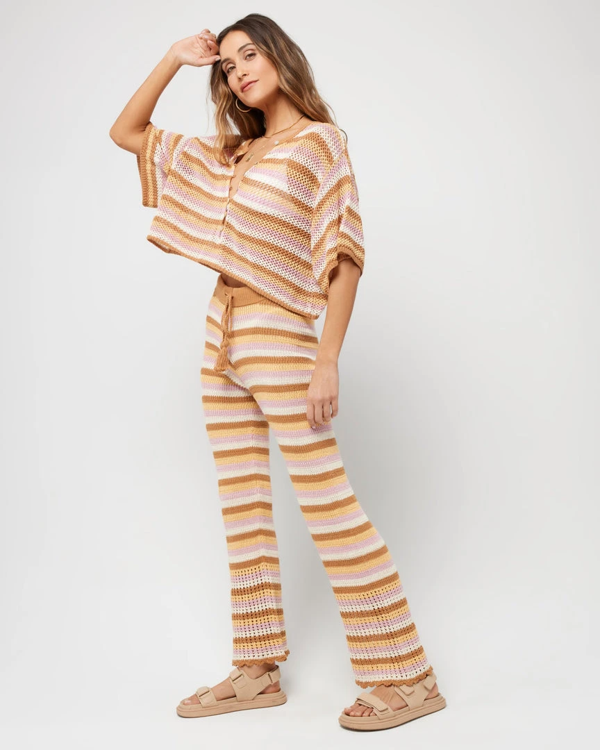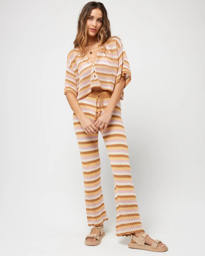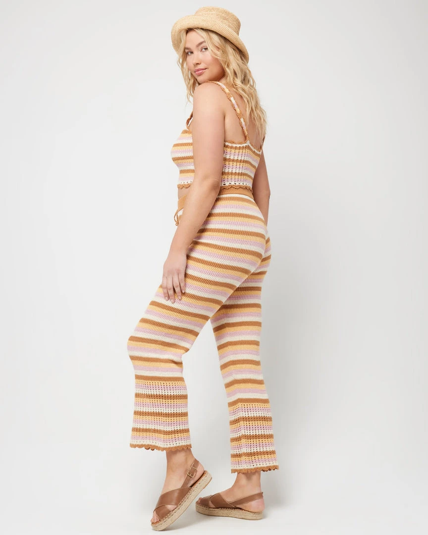 All easy and comfy vibes, the Turn The Tide Pant is a crochet straight wide legged pant with scalloped edges, open stitching at the ankles and self-tie drawstring at the waistband. Perfect for mixing and matching with the Turn The Tide Top.