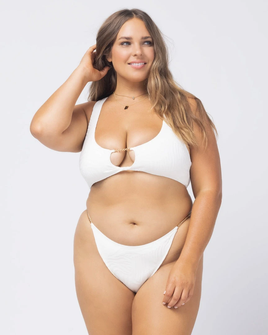 The Jaylo Bikini Top understands the assignment. This pullover style top with racerback comes with removable pads and is constructed from Wild Side texture fabric. Punctuated with a metal chain and twist detail in the front.