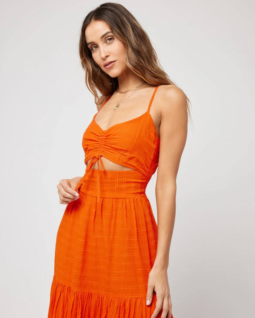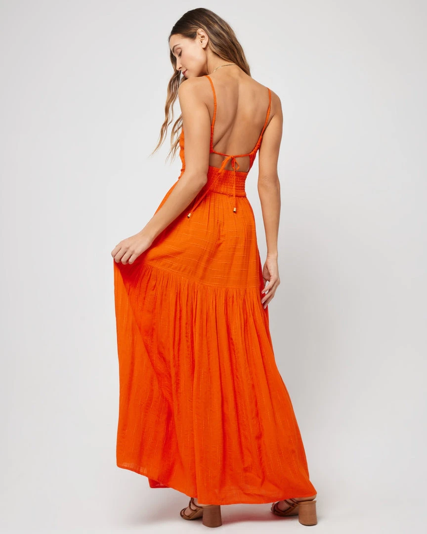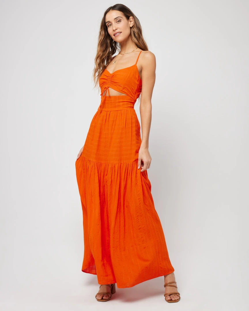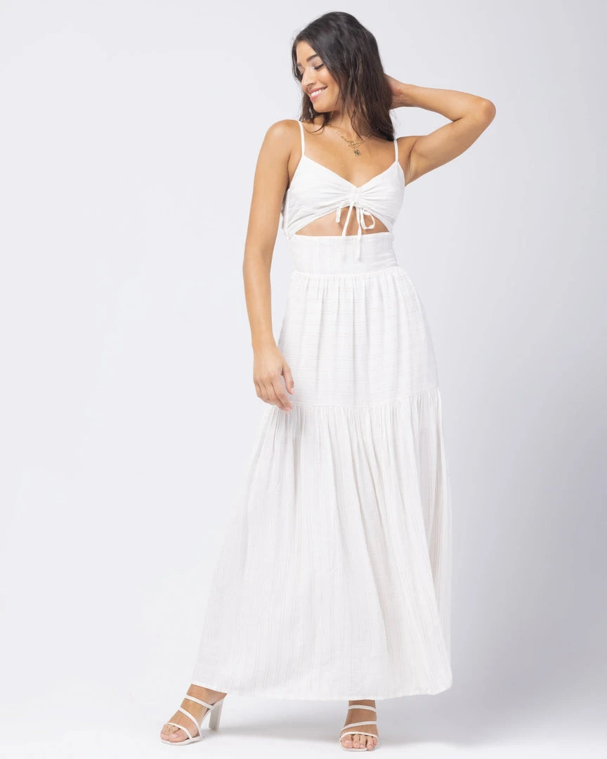 Greet the summer head on in the Zuri Dress. With its A line silhouette, this full length dress with short skirt lining comes with an adjustable cinched tie at the keyhole in the front and a waist seam with shirring. A smocked back panel with adjustable back tie allows for flexible comfort.